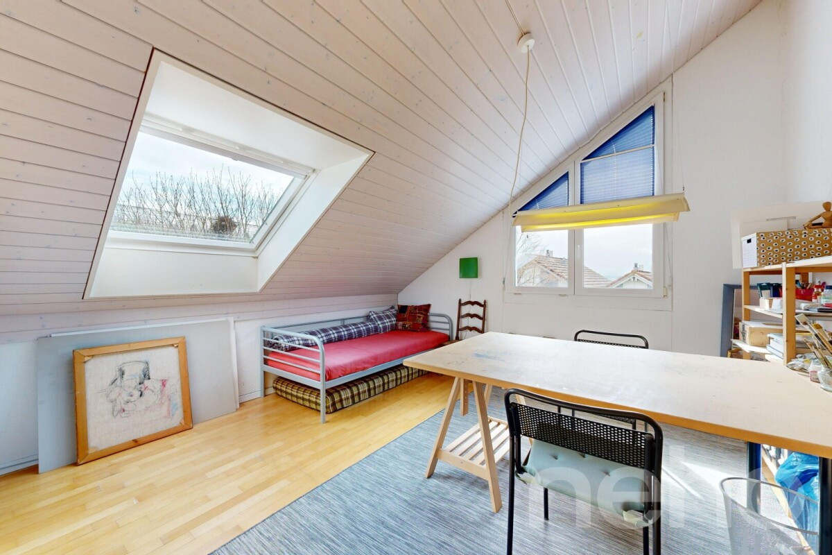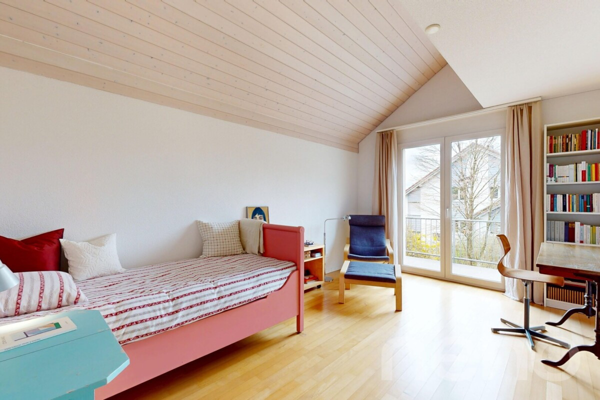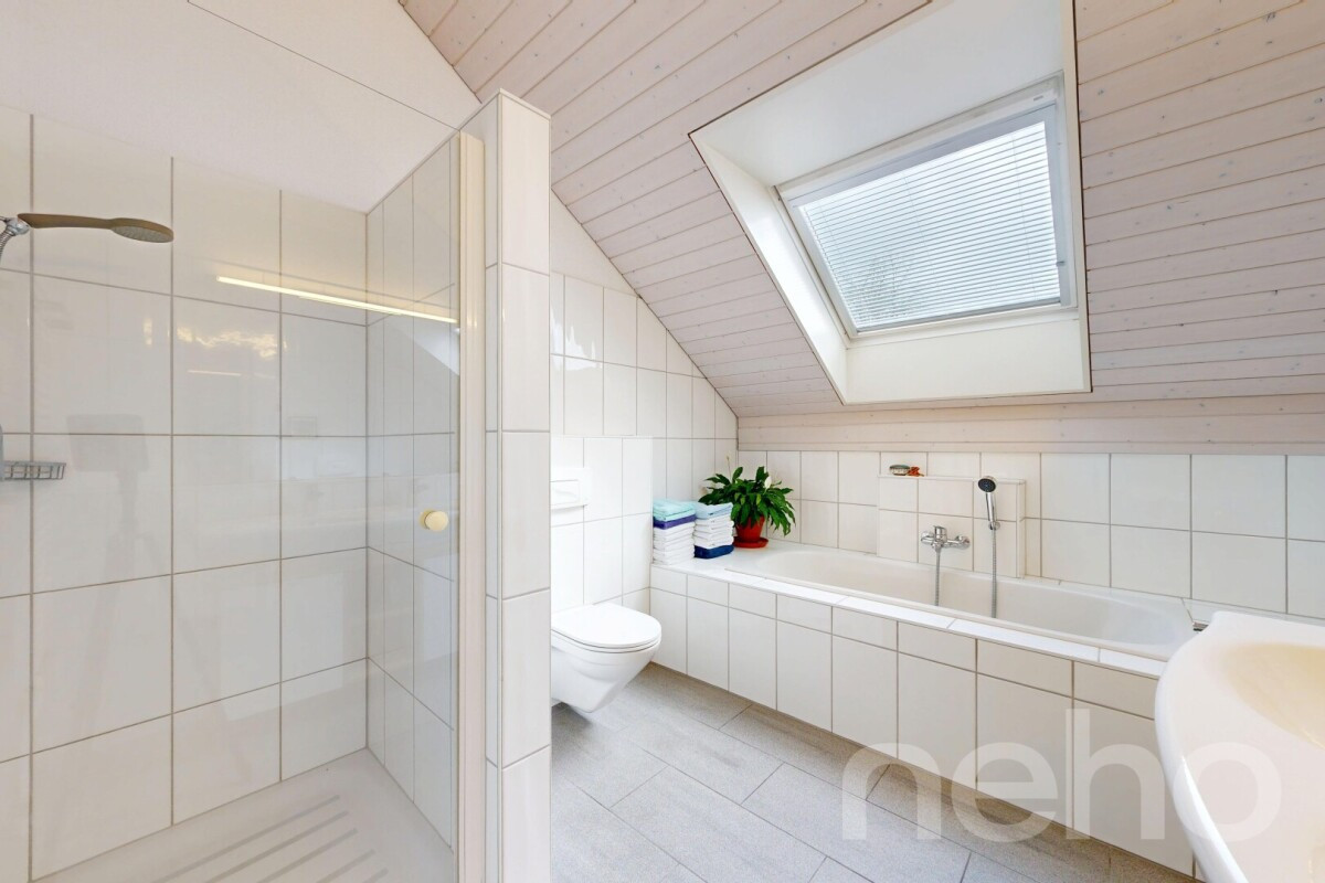 Im Obergeschoss befinden sich drei Schlafzimmer sowie ein grosszügiges Badezimmer mit Badewanne, Dusche, WC und Doppellavabo. Ein Balkon bietet zusätzliche Aussenfläche mit schöner Aussicht.