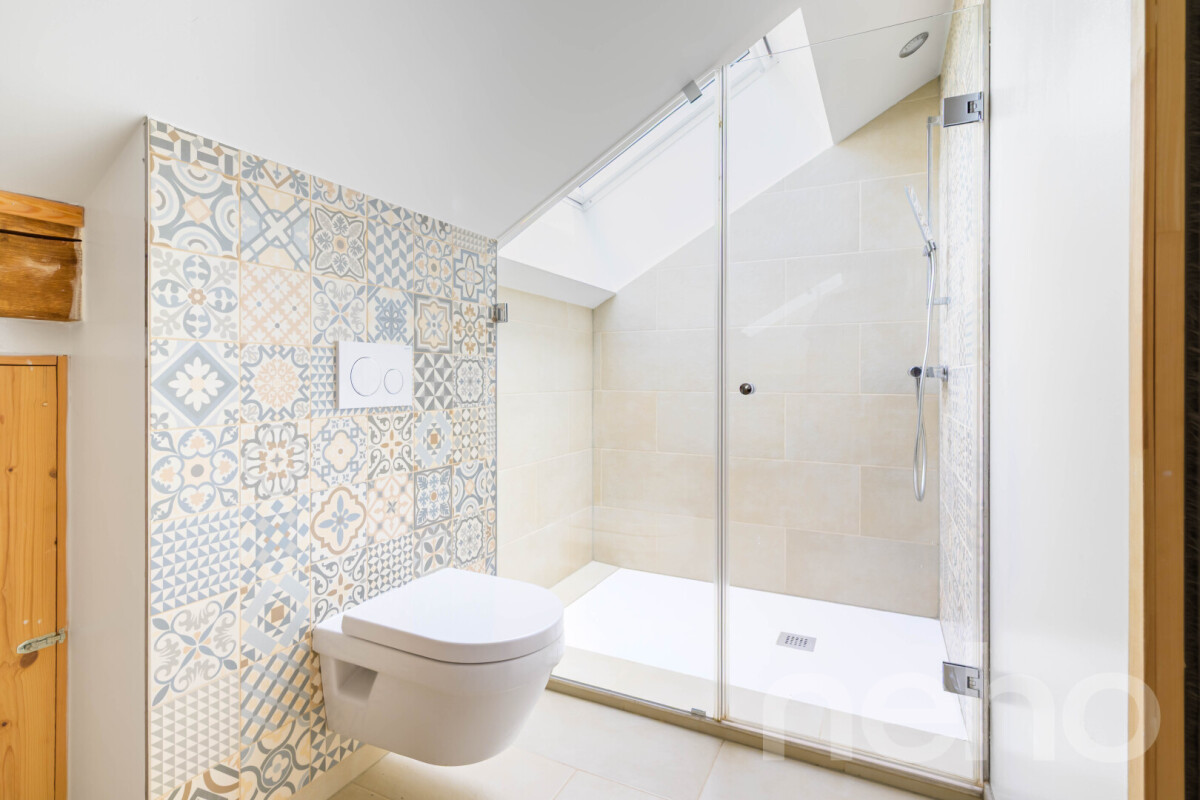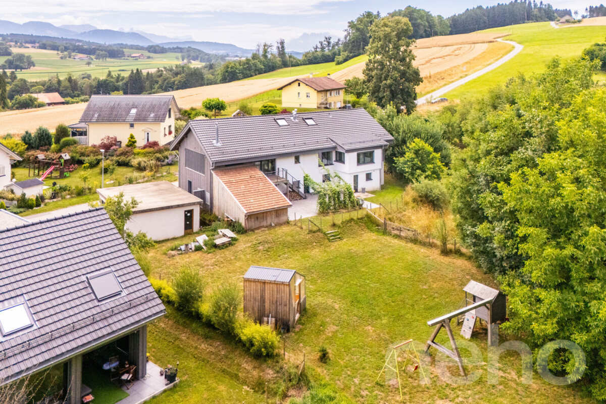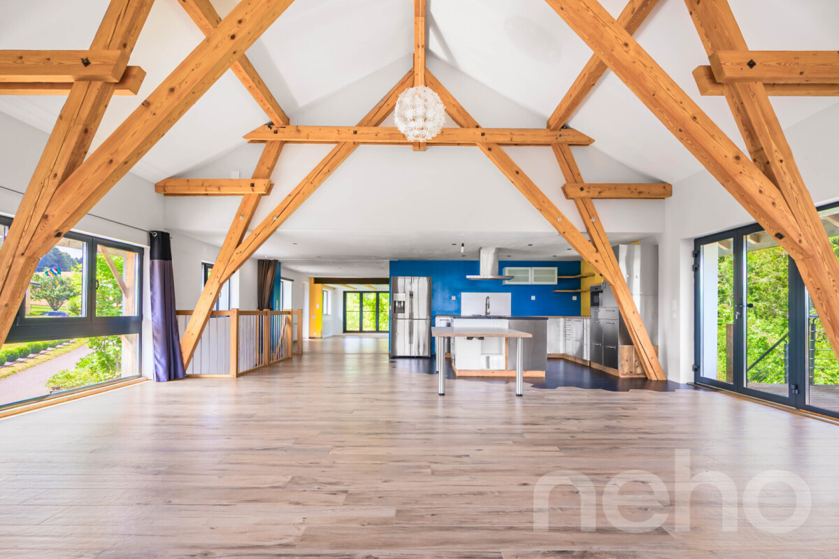 The living room impresses with its generous volume and louvered windows. At the heart of the home is an open-plan kitchen with a large modular island, perfectly designed for everyday life. A wood-burning stove with a heat recovery system adds warmth and ambiance to the space.