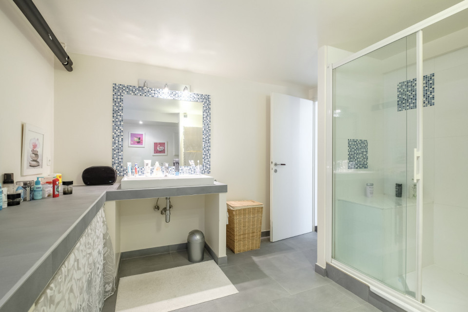Rez : un hall d’entrée avec armoires de rangement, un spacieux séjour avec cheminée et belle hauteur sous-plafond avec accès terrasse, une cuisine équipée fermée avec accès terrasse, une chambre avec salle d’eau (douche - lavabo - wc), une chambre avec salle d’eau (douche à l’italienne – lavabo double vasque), quatre chambres supplémentaires, une salle d’eau (baignoire – lavabo – wc)