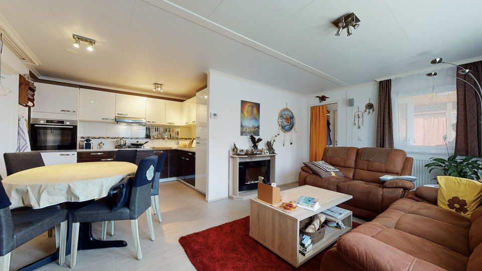 Une véranda, un hall de distribution, une cuisine ouverte salle à manger/ salon, deux chambres, un bureau et espace buanderie.