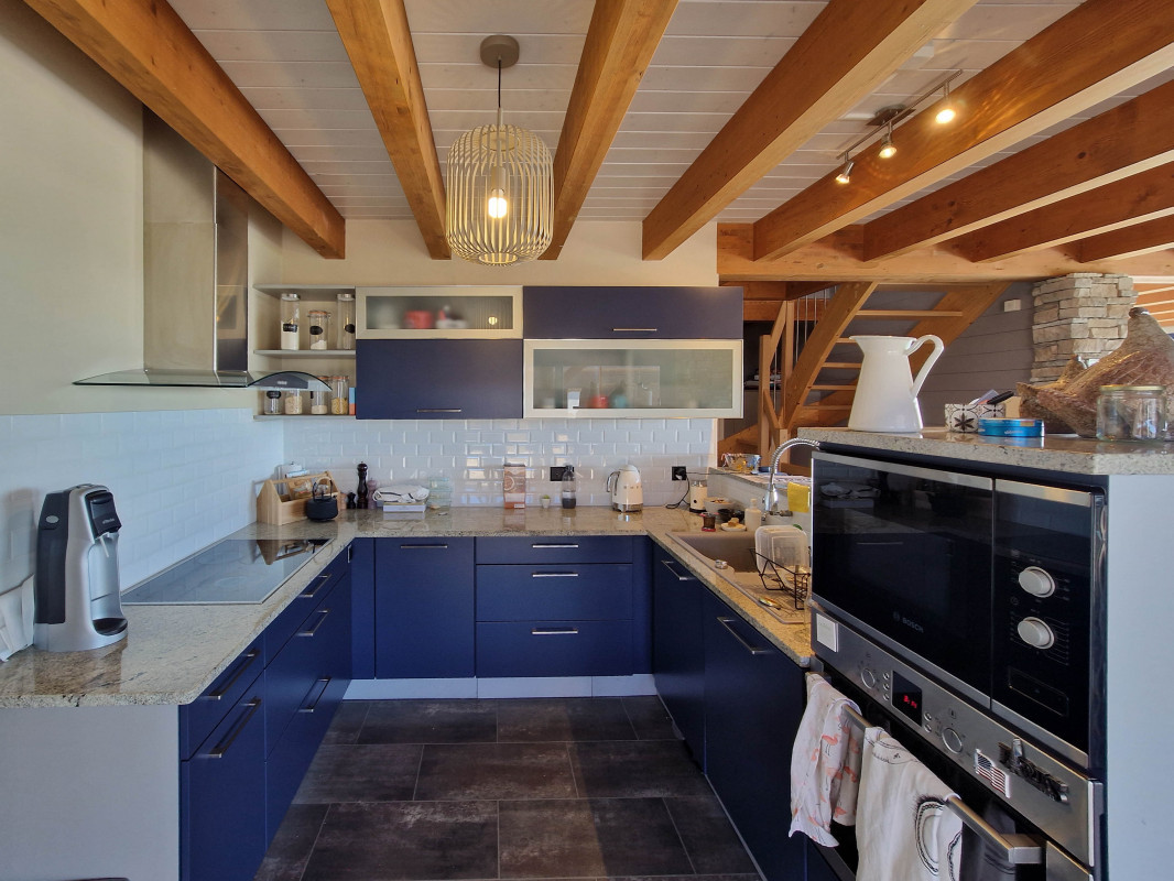 The main living area, enhanced by a wood-burning stove, opens seamlessly onto a contemporary, fully equipped kitchen, extended by a renovated pantry. The upper floor reveals a carefully arranged night area, including a master suite with a walk-in closet and unobstructed views, as well as an open lounge that can accommodate an office or play area.
