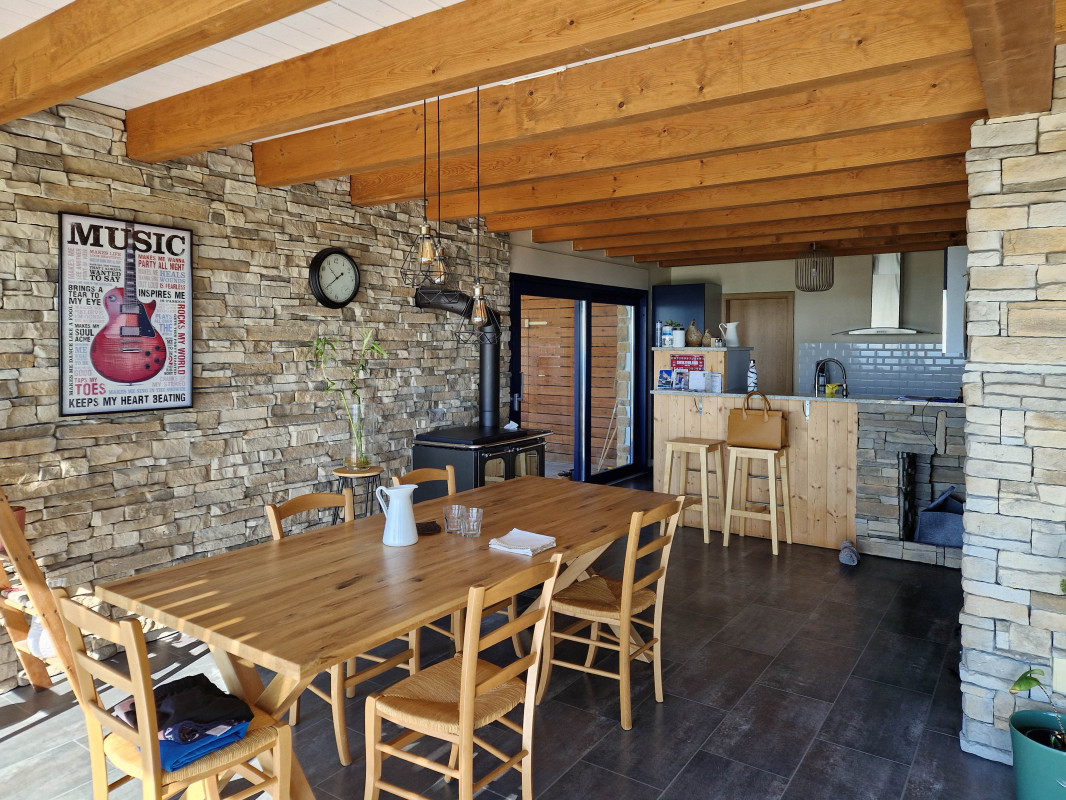 Designed with a resolutely ecological approach, the home is equipped with solar panels, a heat pump, underfloor heating, and a rainwater recovery system, ensuring daily comfort and energy efficiency.