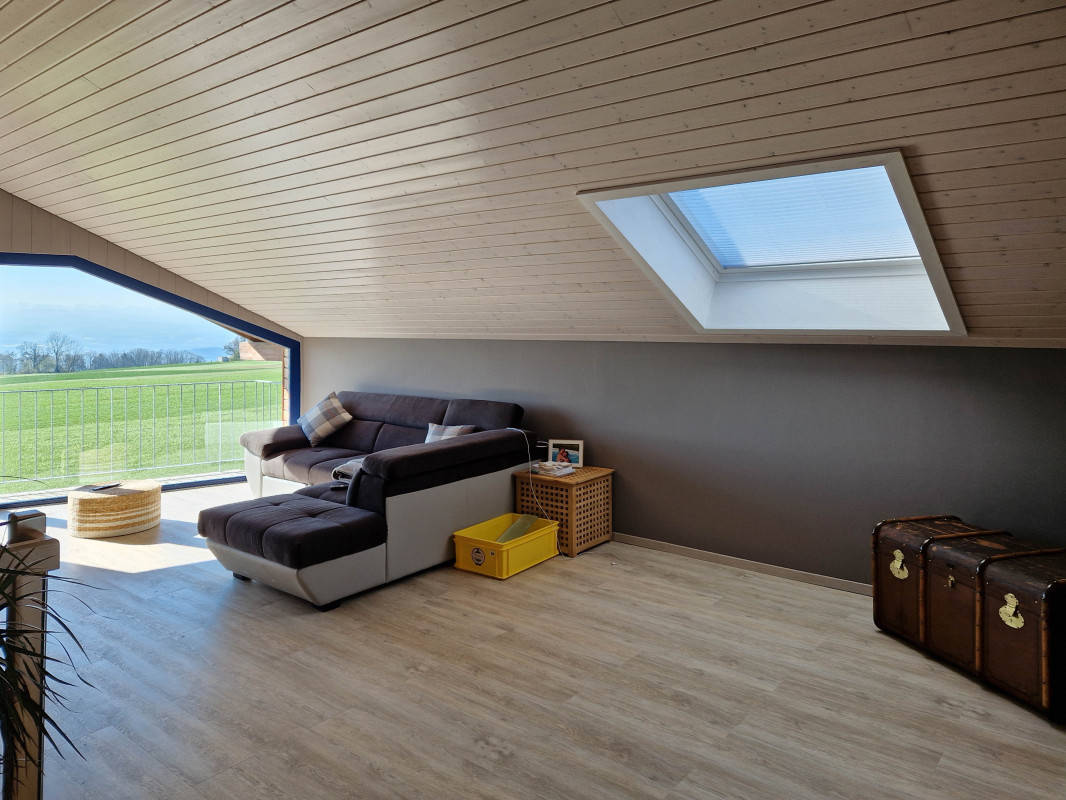Au cœur d’un environnement paisible et verdoyant, cette villa individuelle séduit immédiatement par son atmosphère chaleureuse et sa vue panoramique d’exception sur les Alpes. Les espaces intérieurs, baignés de lumière grâce aux larges baies vitrées, offrent une sensation d’ouverture et de confort rarement égalée.