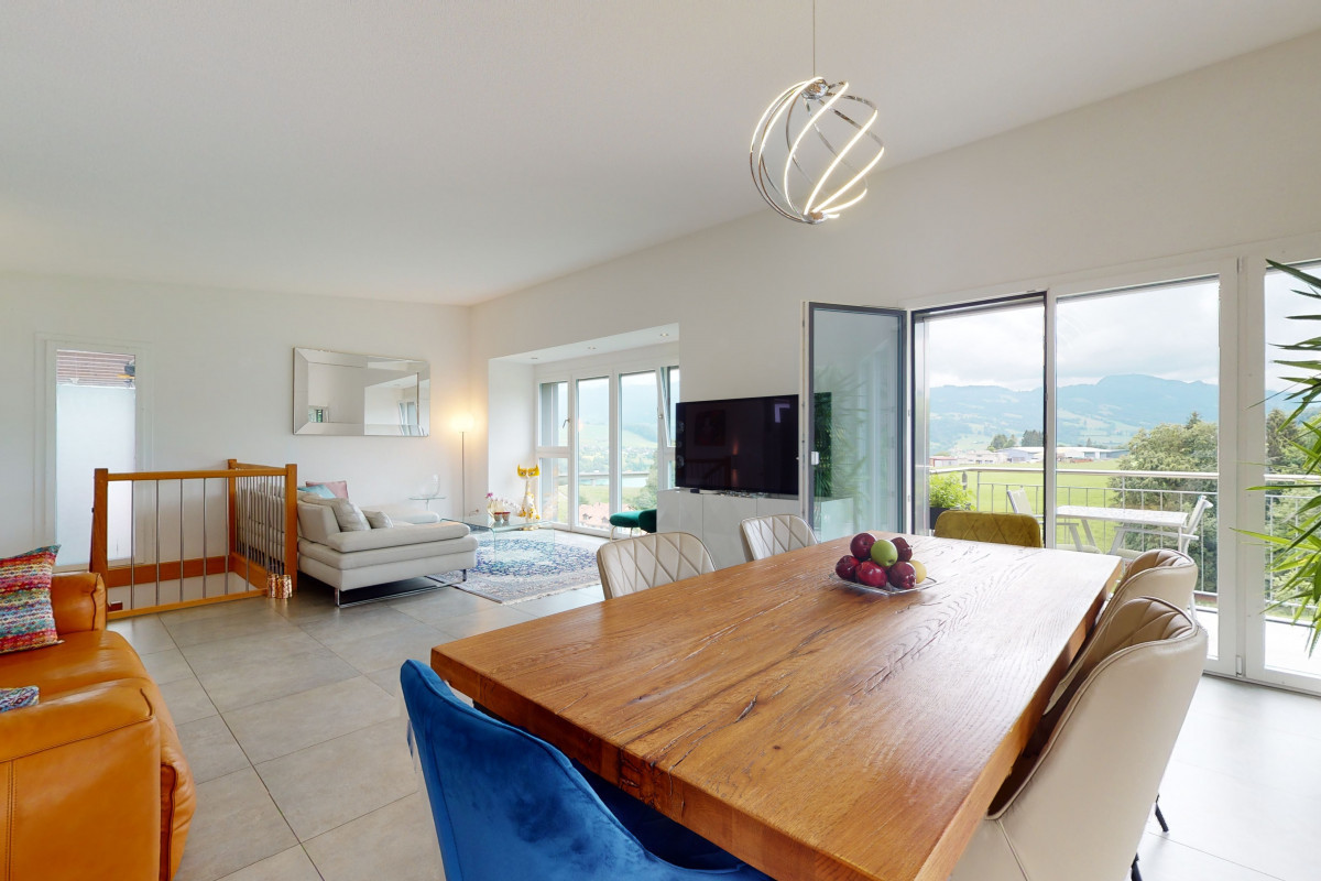 Diese schöne MINERGIE-zertifizierte Villa ist ideal in der Nähe von Schulen, ÖV und Einkaufsmöglichkeiten gelegen und bietet eine atemberaubende Aussicht auf den See und die Berge.Moderne zeitgenössische Konstruktion mit hochwertigen Materialien und mit der Möglichkeit einen unabhängigen Raum mit dem Haus zu verbinden. Im Aussenbereich findet man einen schönen Garten mit Grünfläche, Obstbäumen und Hochbeeten.Das Grundstück auf der gegenüberliegenden Seite liegt in einer landwirtschaftlichen Zone