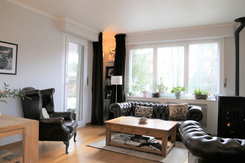 le séjour avec cheminée et accès à la terrasse et au grand jardin arboré