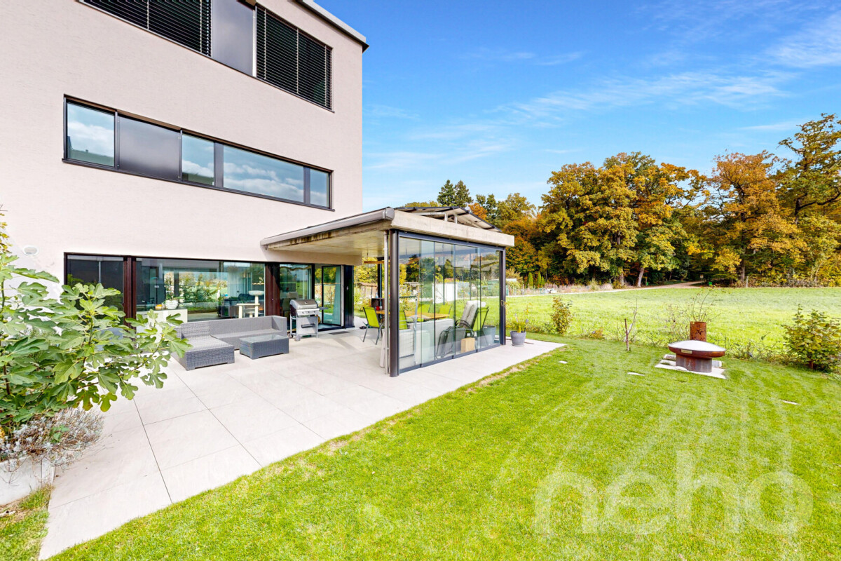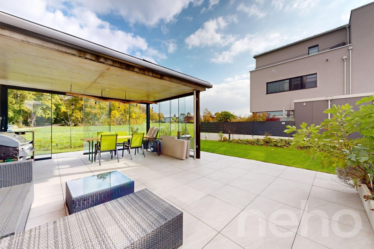 Bereits beim Betreten des Hauses werden Sie von einem einladenden Eingangsbereich mit viel Platz für Garderobe und Stauraum empfangen. Gleich daneben befindet sich ein praktisches Gäste-WC, das den Komfort im Alltag zusätzlich unterstreicht. Herzstück des Erdgeschosses ist der grosszügige Wohn- und Essbereich mit direktem Zugang zum weitläufigen Garten. Dank der offenen Gestaltung verschmelzen Wohnzimmer, Esszimmer und die moderne Küche zu einem einladenden Lebensraum, in dem sich Alltag und Geselligkeit perfekt vereinen. Eine zweite Leitung in der Küche für nicht entkalktes Wasser ist ebenfalls vorhanden. Ein Highlight ist die charmante Pergola, deren drei Seiten verglast und eine Seite offen gestaltet sind - ein einzigartiger Ort, um die Natur geschützt zu geniessen, sei es im Sommer oder in den kühleren Jahreszeiten. Auf dem Dach der Pergola sind zudem acht Solarpanels installiert, die einen wertvollen Beitrag zur Energieeffizienz leisten.