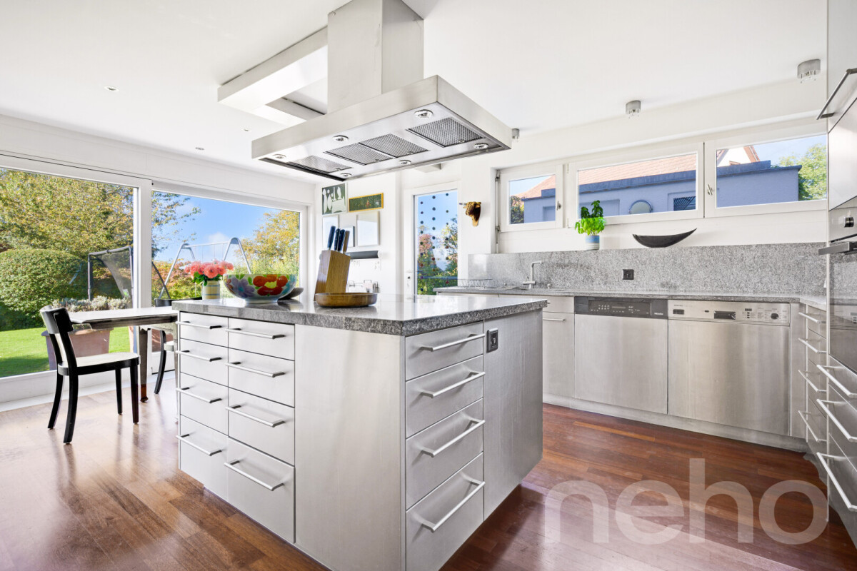 Das helle, grosszügige Wohnzimmer und der Essbereich mit halboffener Küche bilden das Herzstück des Hauses. Ein stilvolles Cheminée sorgt für Wärme und eine angenehme Atmosphäre. Von hier aus gelangt man direkt auf die mit Glyzinien bewachsene Pergola - eine einladende Atmosphäre - perfekt für gemütliche Stunden mit Familie und Freunden.Ein direkter Zugang zur geschlossenen Garage sorgt für höchsten Komfort und erleichtert den Alltag. Auf derselben Ebene befindet sich eine praktische, separate Küche, die ideal für Hobbyköche geeignet ist. Zahlreiche Einbauschränke bieten großzügigen Stauraum und tragen zu einer aufgeräumten Wohnatmosphäre bei. Ein zusätzliches Gäste-WC rundet das Angebot auf dieser Etage ab.