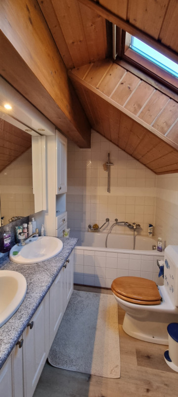 À l’étage, vous trouverez trois chambres confortables ainsi qu’une salle de bains avec double lavabo, baignoire et WC. Les combles offrent un espace de rangement pratique.