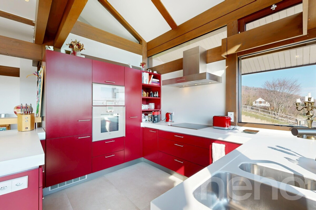 Située dans un cadre naturel préservé, cette villa de 2008 signée HUF HAUS se distingue par ses lignes épurées et ses matériaux écologiques de haute qualité. Parfaitement entretenue, elle offre une transparence totale avec la nature grâce à sa structure emblématique alliant le bois et le verre.L'intérieur propose de vastes espaces ouverts baignés de lumière naturelle. Le séjour, doté d'une généreuse hauteur sous plafond, s'ouvre sur une cuisine moderne entièrement équipée. Ce niveau de vie accueille une première suite parentale complète avec son propre dressing et sa salle de bain privative. À l'étage, une galerie surplombe la pièce de vie et mène à deux chambres supplémentaires, dont l'une dispose également de son espace dressing, accompagnées d'une salle de bain.Le niveau inférieur est entièrement aménagé avec une pièce chauffée polyvalente idéale pour un bureau ou une salle de jeux. On y trouve également une buanderie et de nombreux espaces de rangement. La propriété dispose d'un garage fermé avec accès direct ainsi que de six places de parc extérieures.Le vaste jardin privatif et la terrasse profitent d'un environnement calme et sans vis-à-vis, offrant une vue panoramique sur le lac et les Alpes. Les commodités villageoises, les écoles et les transports publics se situent à proximité immédiate de la maison.