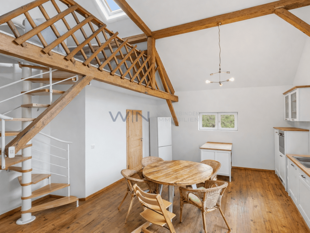 + WOHNSTRUKTUR: Haupthaus bestehend aus einer eigenständigen Loft-Dachwohneinheit sowie zwei Zimmern und einem Studio mit Gemeinschaftsküche und gemeinschaftlichem Bad. Hochwertig ausgebaute Scheune als giebeloffene Loftwohnung mit Galerieebene (ca. 3,5 Zimmer).