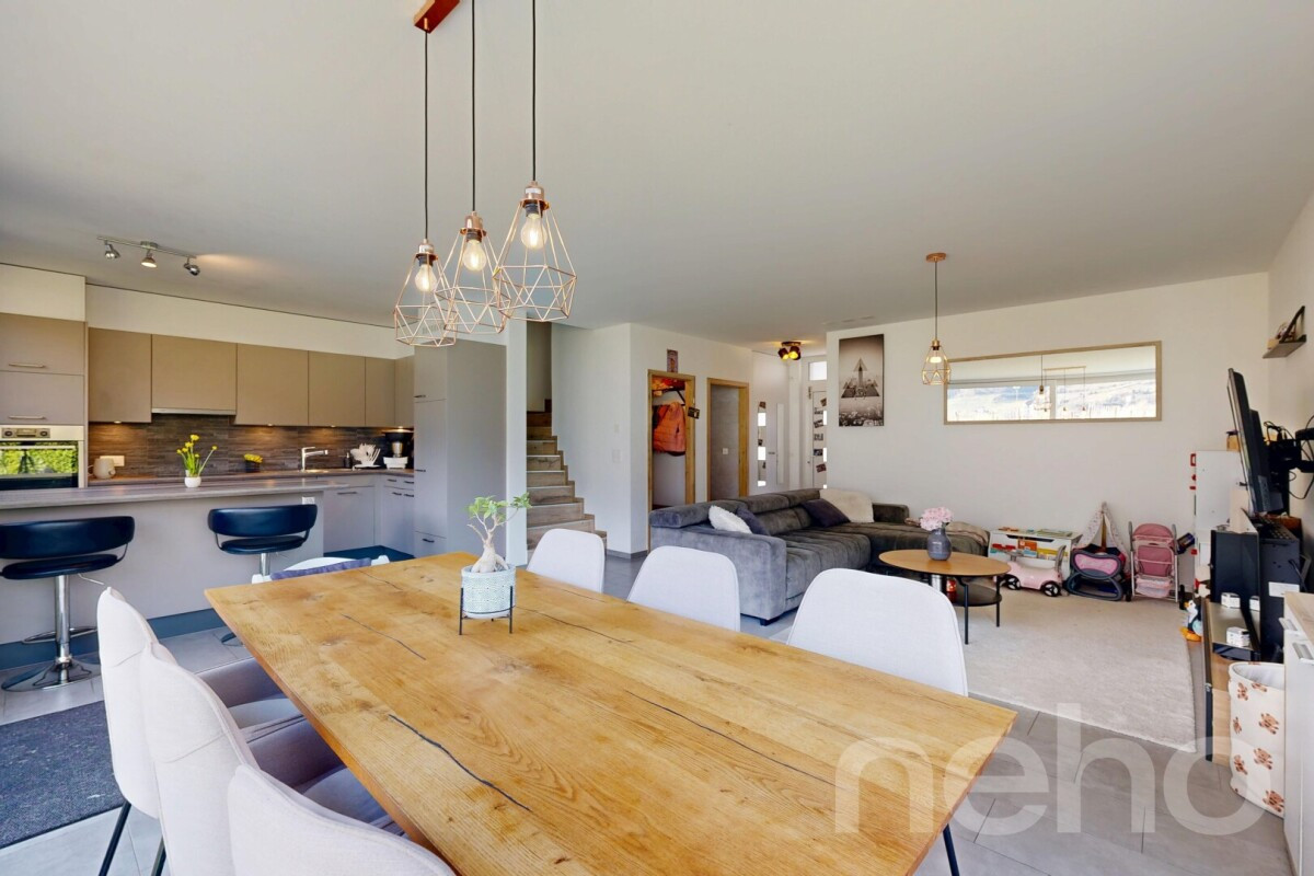 Ideally positioned at the end of the row, this beautiful townhouse benefits from the best location within the development, offering completely unobstructed views and a bright, privileged living environment.From the outside, the property already impresses with its practical features: two outdoor parking spaces, one of which is covered, providing added comfort throughout the year.Inside, the house offers generous and well-balanced living spaces. It features three spacious bedrooms, two bathrooms including one with a bathtub, as well as a guest WC. The excellent ceiling heights enhance the sense of space and natural light throughout the home.The master bedroom is a true highlight of the property. Large floor-to-ceiling windows flood the room with natural light and offer open views, creating a unique atmosphere and a remarkable feeling of space and well-being.Outside, a spacious terrace of approximately 20 m² invites you to relax and entertain, complemented by a large garden ideal for enjoying outdoor living.This property combines comfort, space, and a prime location, making it a must-see.