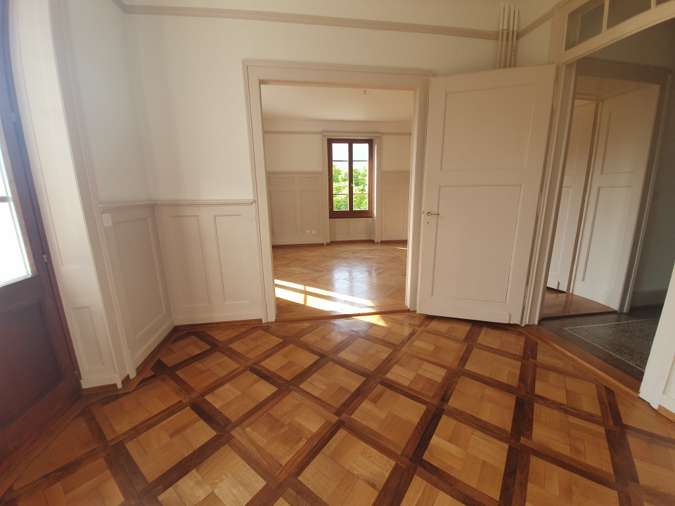 Revêtement de sol : Parquet massif à fougères en chêne et noyer dans les chambres et les salons, carelage dans les cuisines et bains