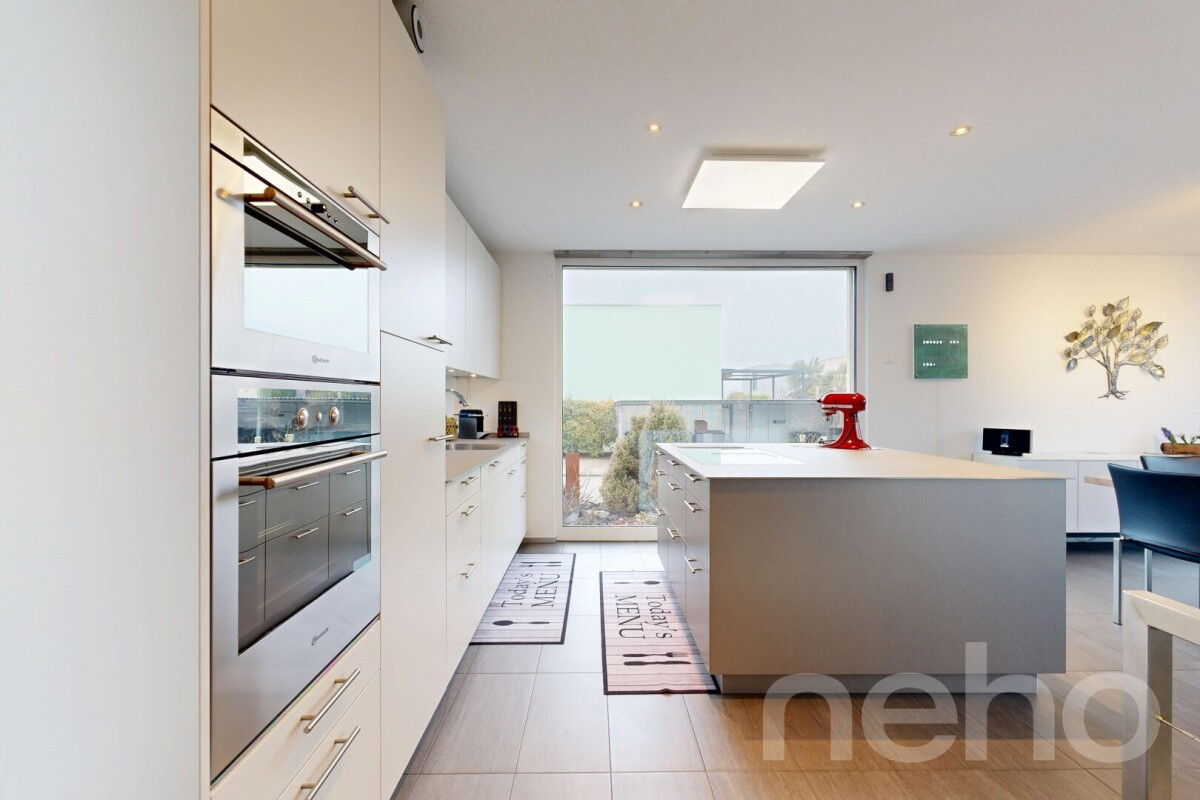 Der lichtdurchflutete Wohnbereich profitiert von raumhohen Fenstern, die ein offenes und freundliches Wohngefühl schaffen. Die moderne Küche ist ein echtes Highlight und verfügt über eine grosszügige Kochinsel mit Chromstahl-Arbeitsplatte. Perfekt für Kochliebhaber und gesellige Abende.