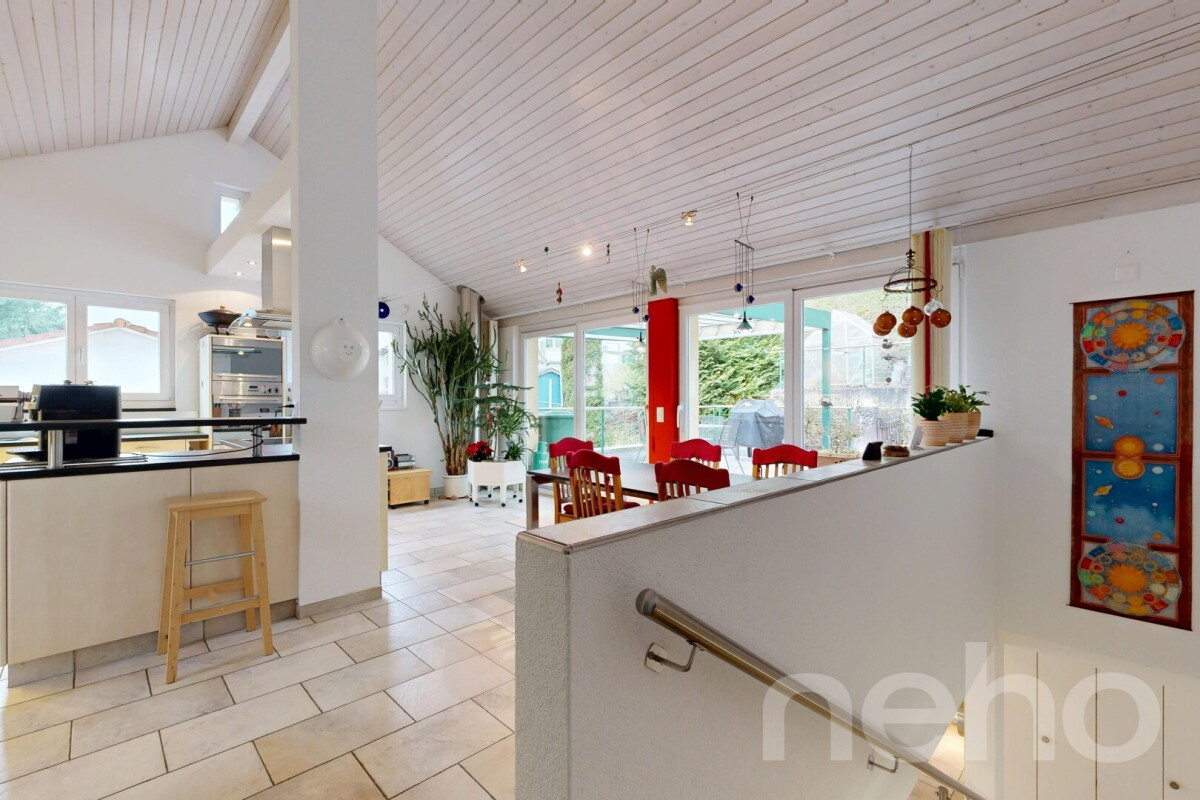 Die grosszügige, offene Küche mit hochwertigen Materialien, V-ZUG-Geräten und einem einladenden Essbereich besticht durch ihre sehr hohen Decken, welche ein luftiges und modernes Wohngefühl schaffen. Ein kleiner Abstellraum mit Waschmaschine und Tumbler ergänzt diese Etage funktional.