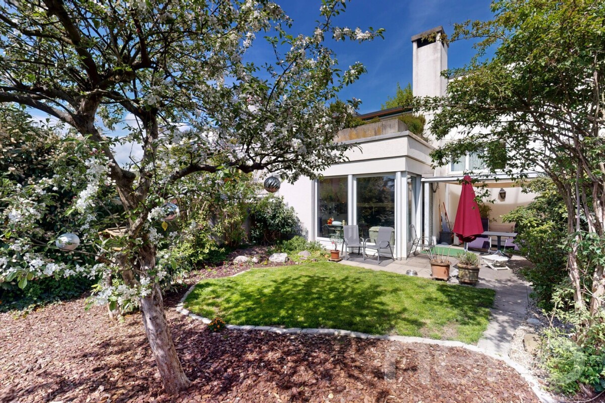 Der sonnige Garten mit gewachsenem Grünbestand und geschützter Terrasse lädt zum Verweilen, Spielen oder geselligen Stunden im Freien ein und erweitert den Wohnraum auf angenehme Weise.