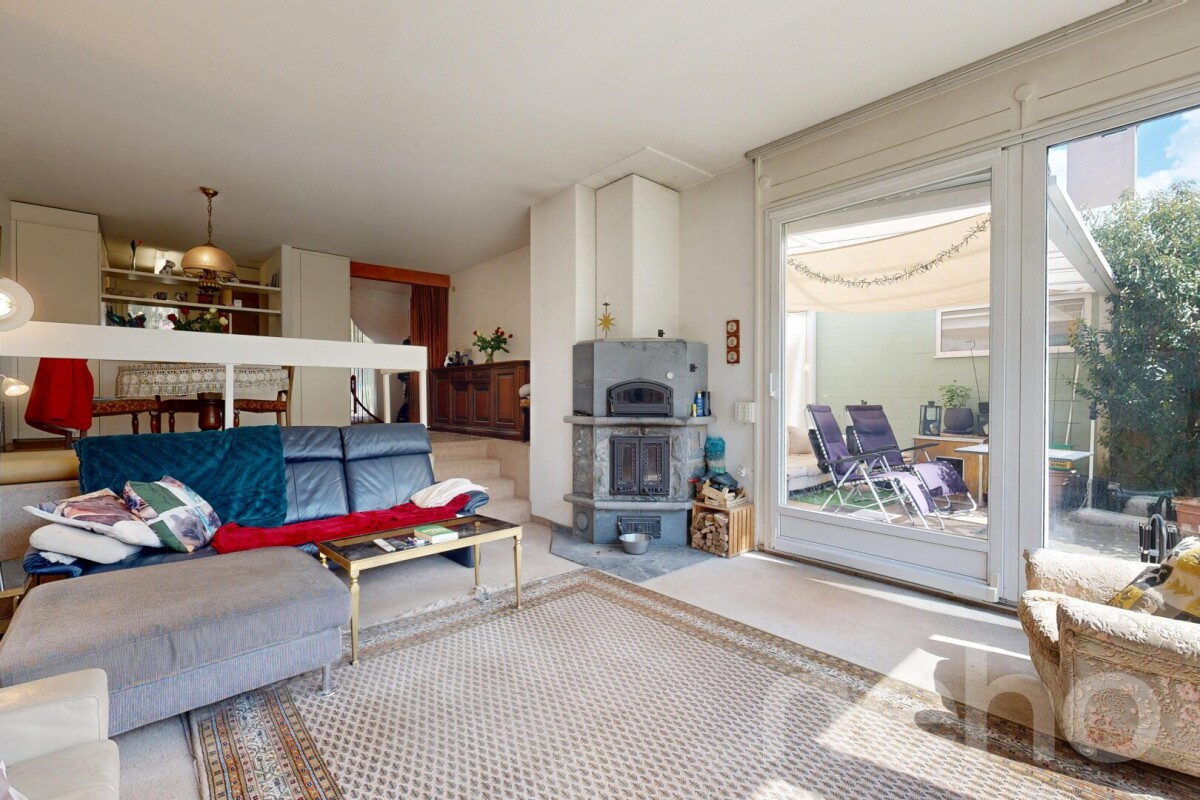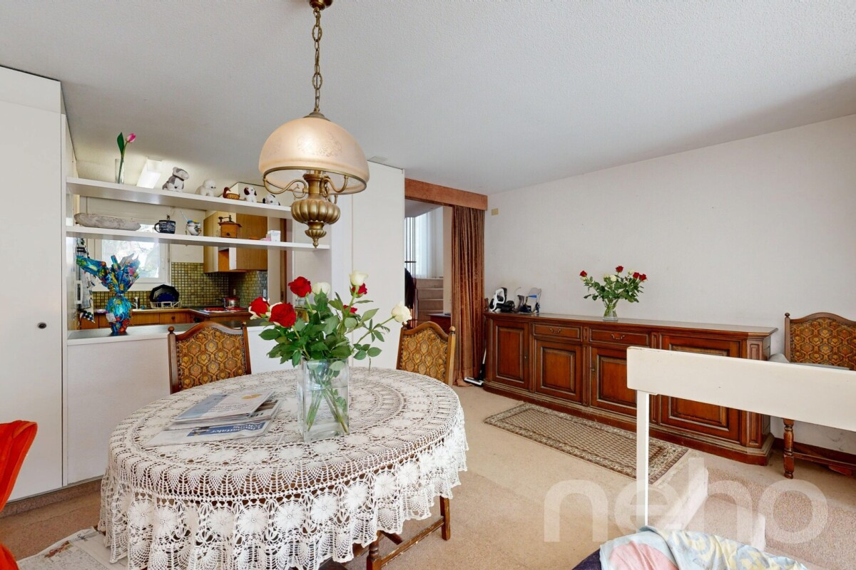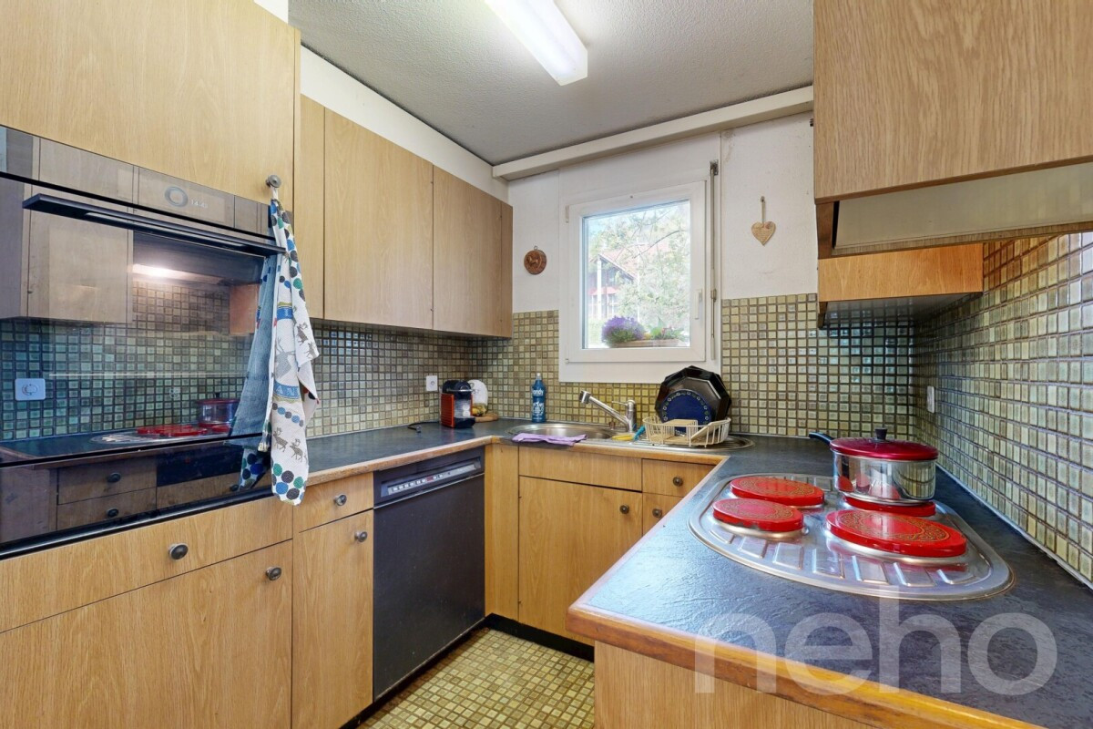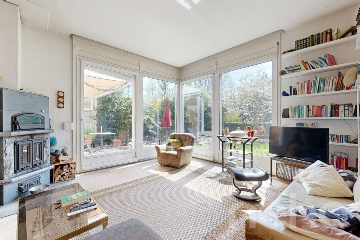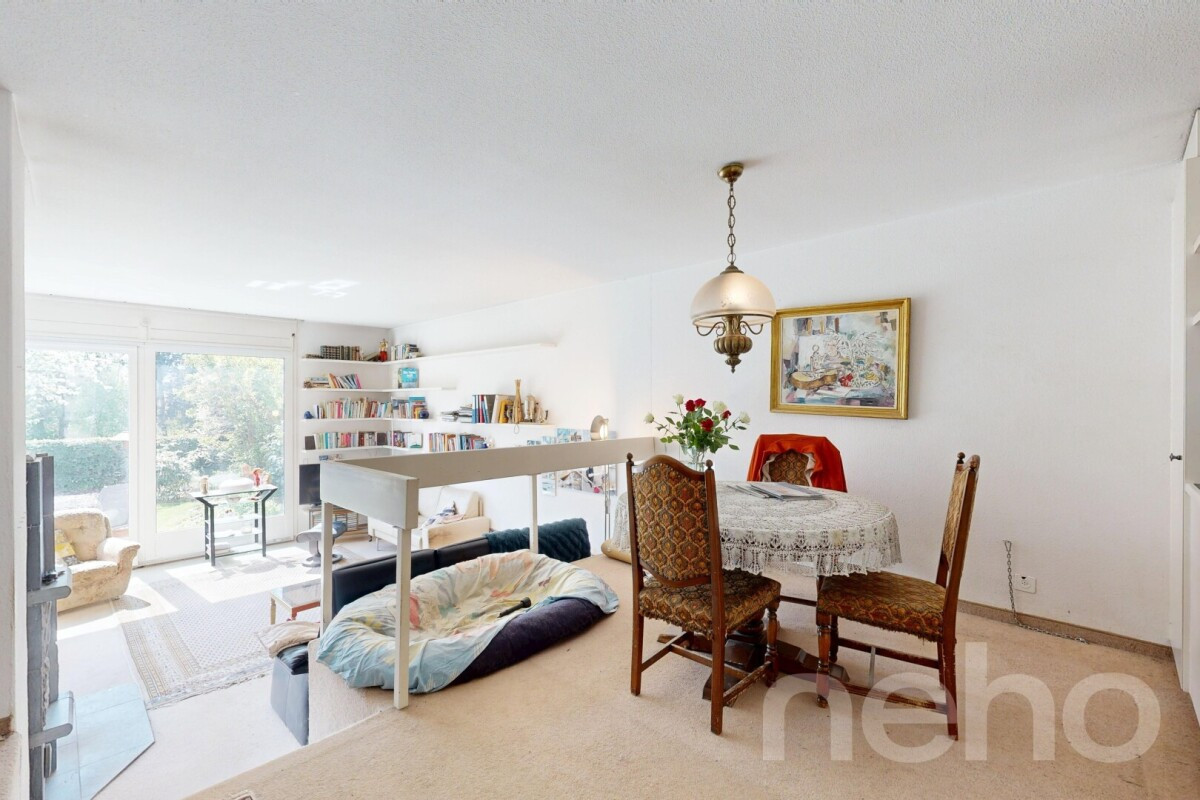 Im Erdgeschoss befindet sich der helle Wohn- und Essbereich mit direktem Zugang zur grosszügigen Terrasse und zum liebevoll angelegten Garten. Die grossen Fensterflächen sorgen für viel Tageslicht und schaffen eine angenehme Verbindung zwischen Innen- und Aussenraum. Die separate Küche ist funktional angeordnet und bietet Potenzial für individuelle Modernisierungsideen.
