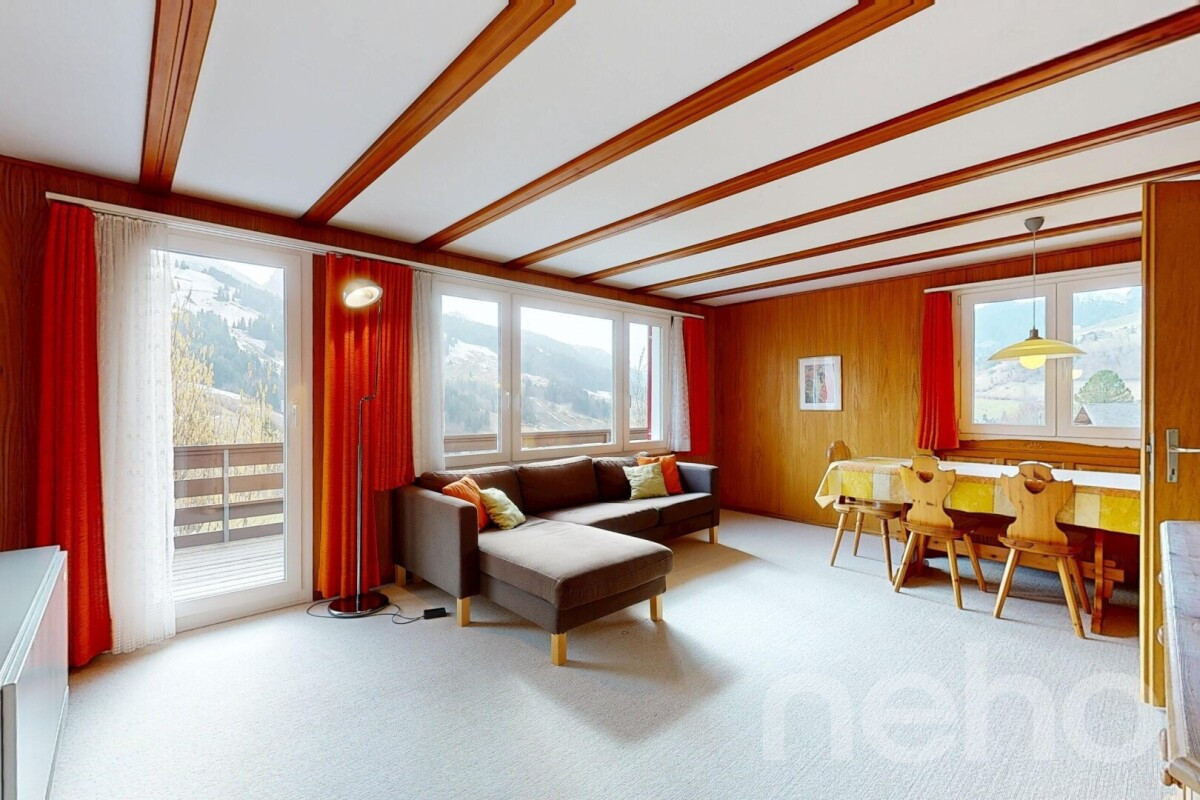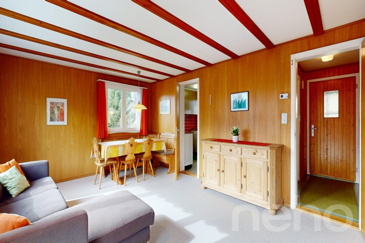 Das Chalet überzeugt durch eine gemütliche und einladende Atmosphäre. Der helle Wohn- und Essbereich bildet das Herzstück des Hauses und lädt zu entspannten Stunden mit Familie und Freunden ein. Große Fenster sorgen für viel Tageslicht und eröffnen schöne Ausblicke auf die umliegende Berglandschaft. Zwei Schlafzimmer bieten ausreichend Platz für Familie und Gäste.