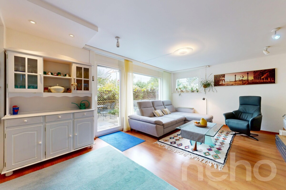 Der Wohn- und Essbereich mit offener Küche ist das Herzstück des Erdgeschosses, während das angebaute Atelier mit Blick in den Garten kreativen Raum bietet. Der Garten selbst wurde mit einer zusätzliche Gartenfläche von ca. 230 m2 im ausschliesslichen Benützungsrecht erweitert. Eine lauschige Pergola und viel Privatsphäre versprechen gemütliche Stunden im Garten.