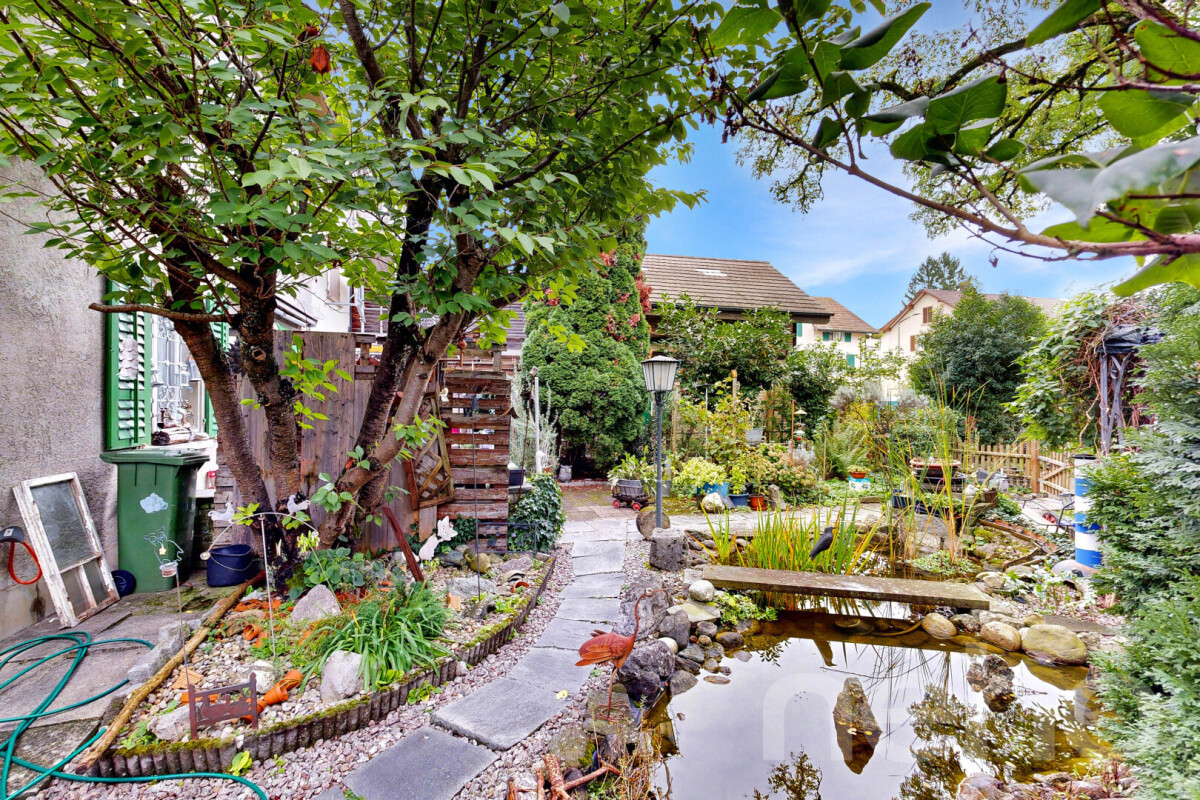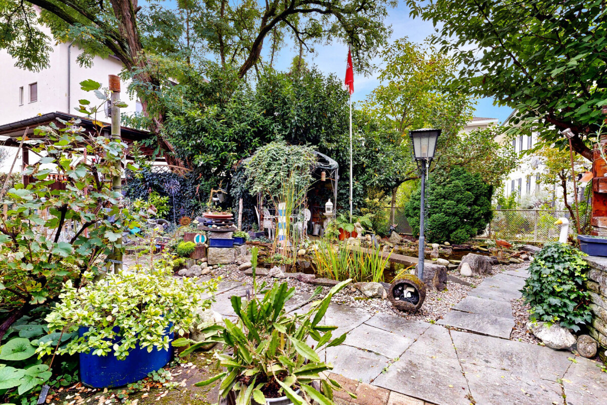 Der Garten mit einem Teich und einer Terrasse bietet ein kleines privates Erholungsgebiet mitten in der Stadt. Das Haus wurde in solider Massivbauweise errichtet und umfasst zudem ein Kellergeschoss mit einer Waschküche und zwei Kellern sowie einen Estrich.