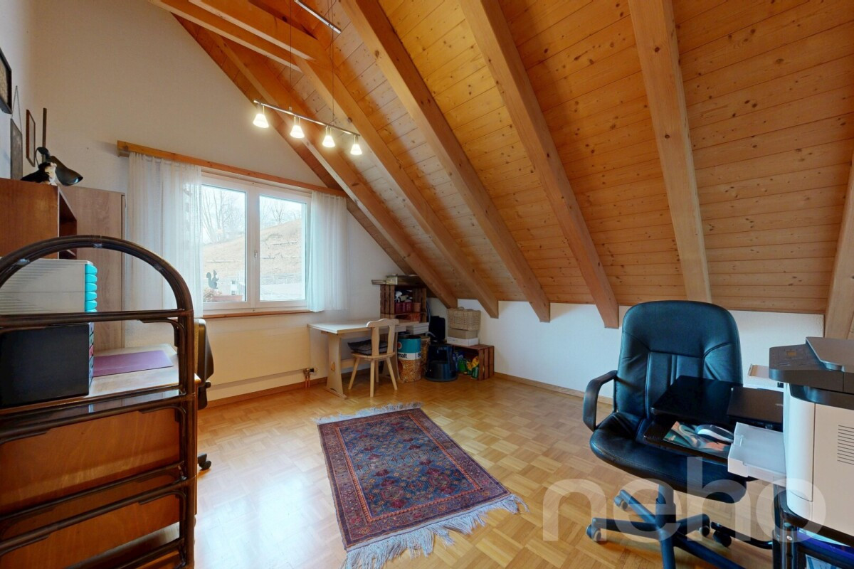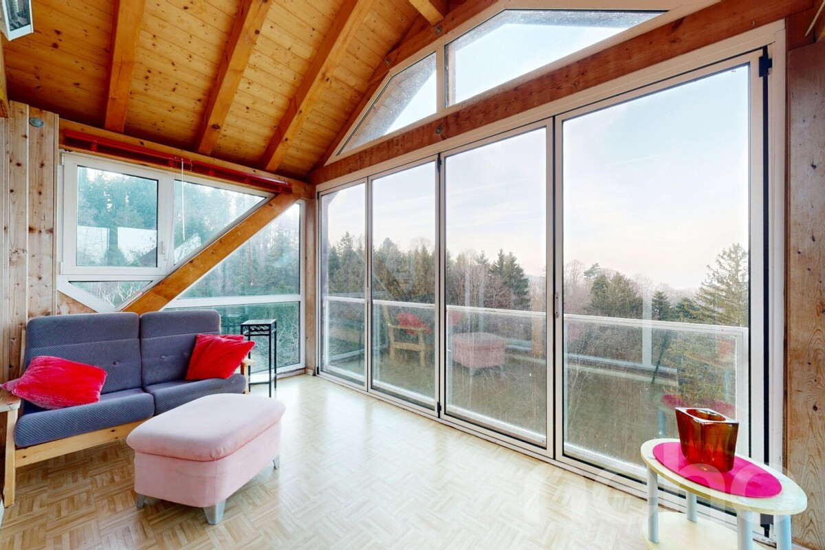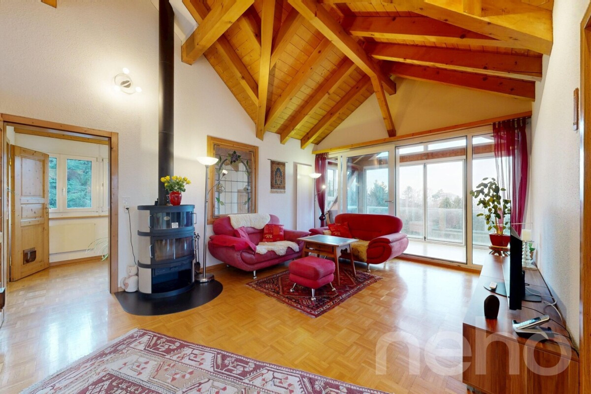 Charmante Dachwohnung mit gemütlichem Wohngefühl, charmantem Cheminée und schöner Aussicht ins Grüne aus dem Wintergarten.