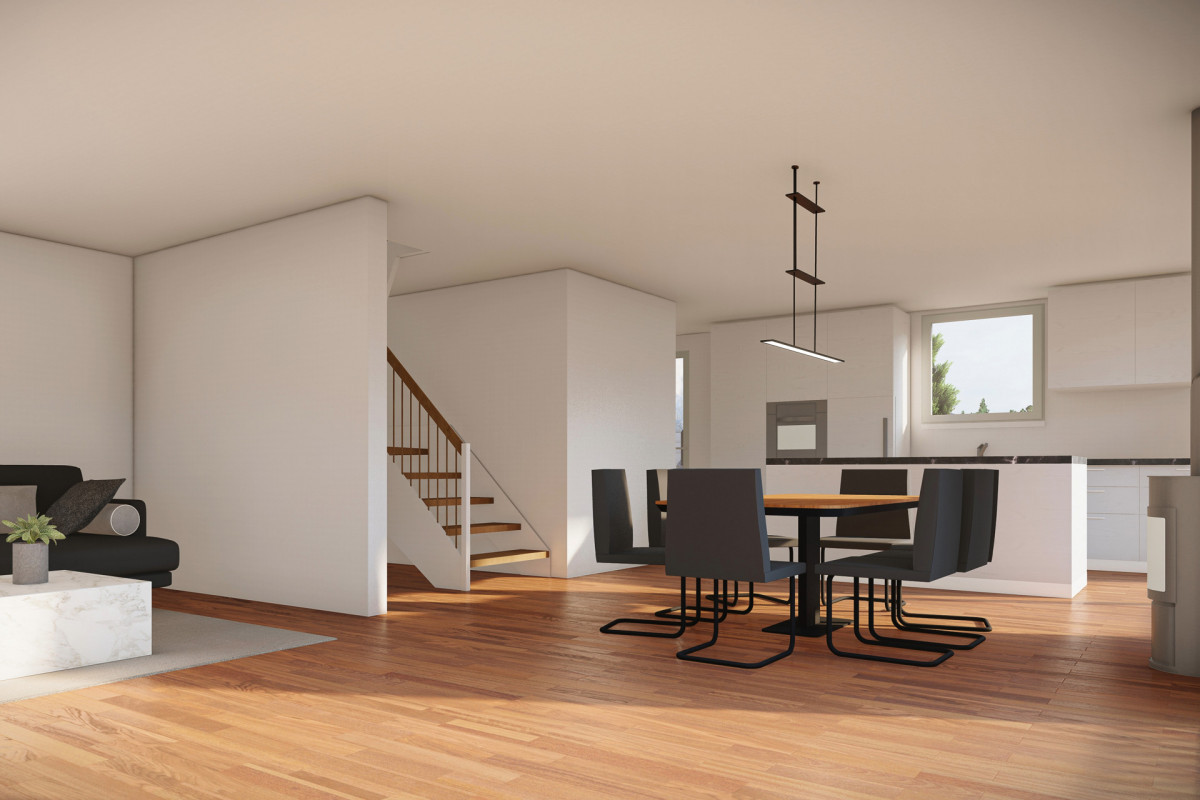 Im Erdgeschoss befindet sich das Entrée mit Garderobe und das Gäste-WC. Der helle und offene Koch-, Wohn- und Essbereich mit grossen Fensterflächen und grosszügiger Terrasse auf drei Seiten runden das attraktive Angebot ab.