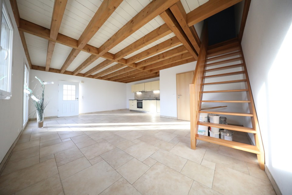 Im Erdgeschoss öffnet sich die Küche / das Wohnzimmer zu einem kleinen Außenbereich (ca. 24 m²) mit Dusche und WC.