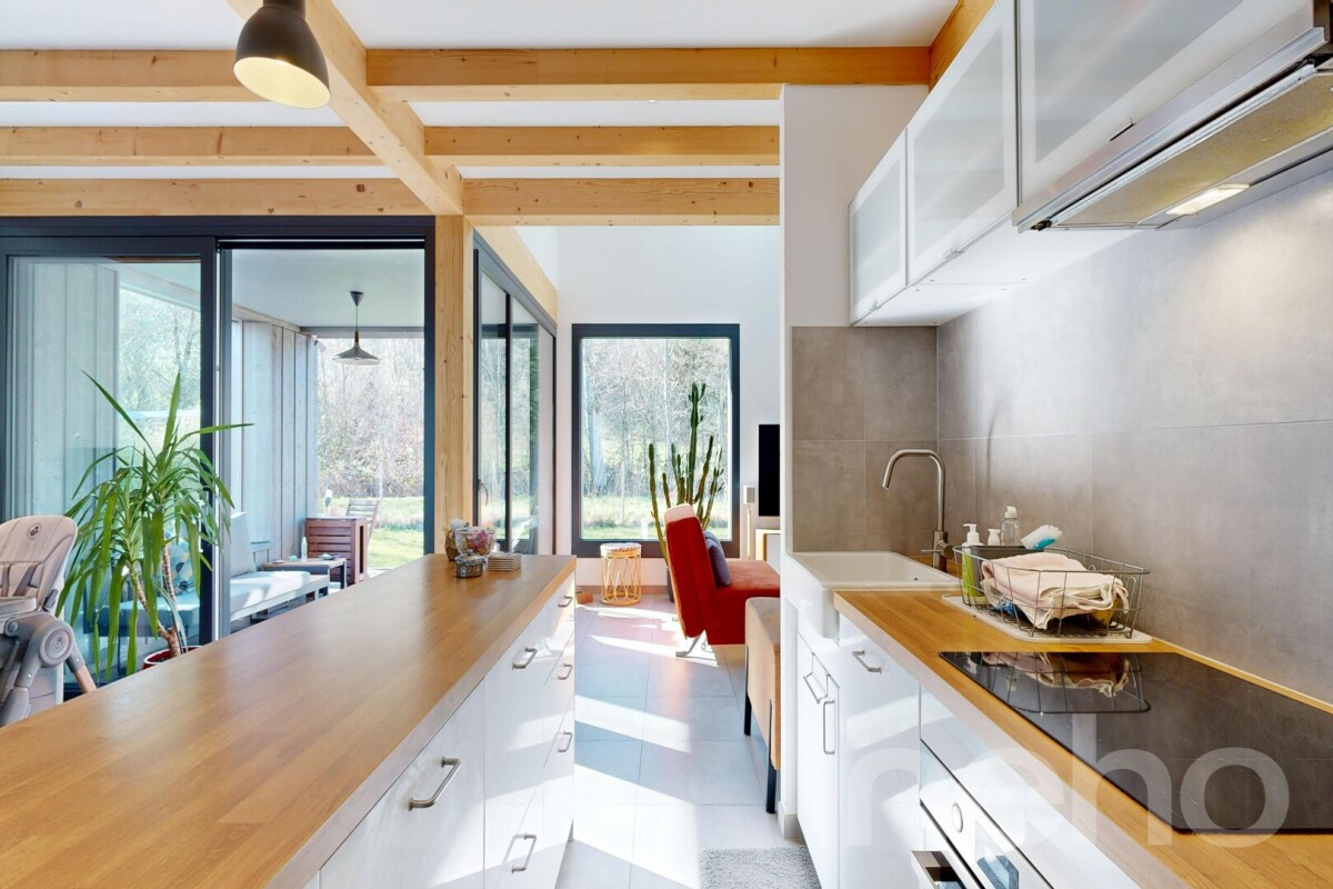 D'une surface habitable d'environ 135 m², le logement s'organise autour d'un espace de vie lumineux comprenant un salon et une salle à manger, agrémenté d'une cuisine indépendante. Ce bel espace séjour est agrémenté d'un poêle à bois et ouvre sur une élégante terrasse abritée. Le rez-de-chaussée accueille également une première chambre à coucher, idéale pour recevoir des hôtes ou aménager un bureau, ainsi qu'une salle de douche.