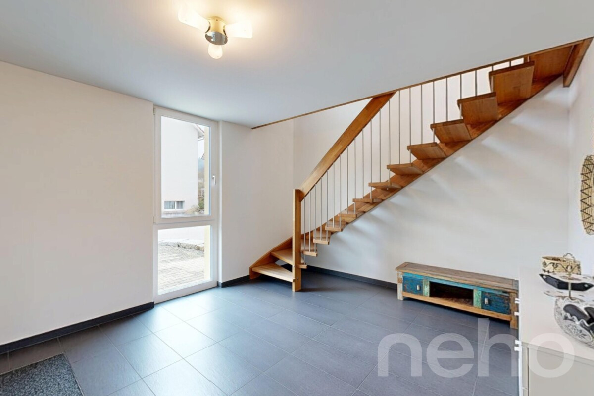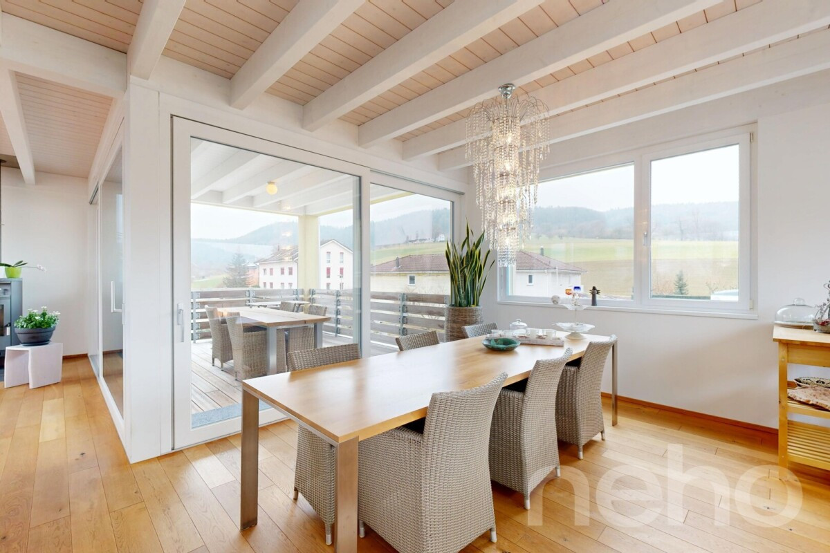 Cette propriété exceptionnelle à Gelterkinden allie confort de vie moderne et multiples possibilités d'utilisation commerciale, offrant ainsi une opportunité rare aux indépendants, artisans ou investisseurs. Cette maison individuelle de 5,5 pièces, avec une surface habitable nette de 133 m², séduit par ses plafonds hauts, ses espaces lumineux et une vue panoramique imprenable. Le salon accueillant, équipé d'un poêle suédois relié au réservoir d'eau, crée une atmosphère chaleureuse et un climat de vie agréable.