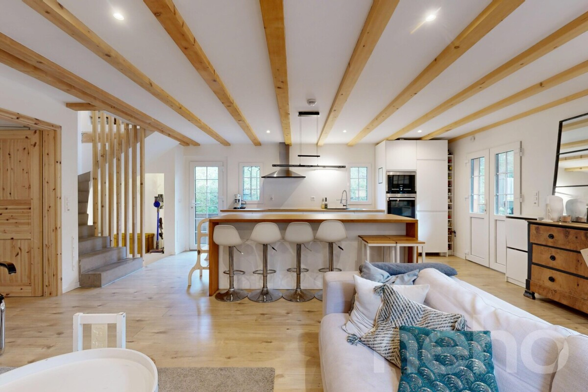 L'alliance des poutres apparentes et du parquet confère une atmosphère chaleureuse et conviviale, sublimée par les escaliers en béton ciré qui apportent une touche contemporaine et élégante.