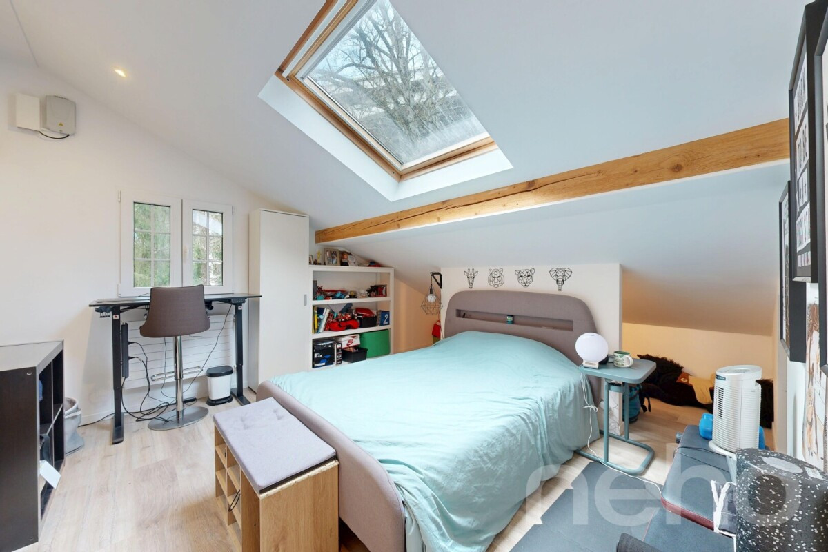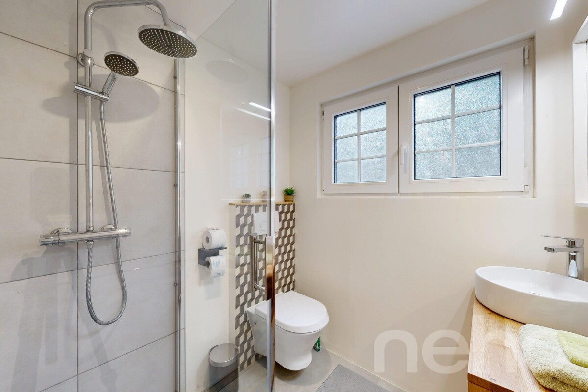Le rez inférieur propose un second salon, une chambre supplémentaire avec sa propre salle de bain, tandis que l'étage abrite deux grandes chambres ainsi qu'une troisième salle de bain, garantissant confort et espace à toute la famille.
