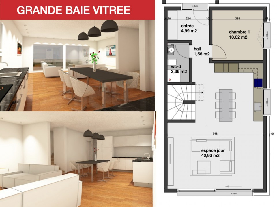 - Erdgeschoss: Eingangshalle, 1 Duschbad (WC, Dusche), 1 Schlafzimmer, geräumiges Wohnzimmer und Wohnzimmer mit Zugang zum Garten im Freien, großes Panoramafenster, halboffene Küche,