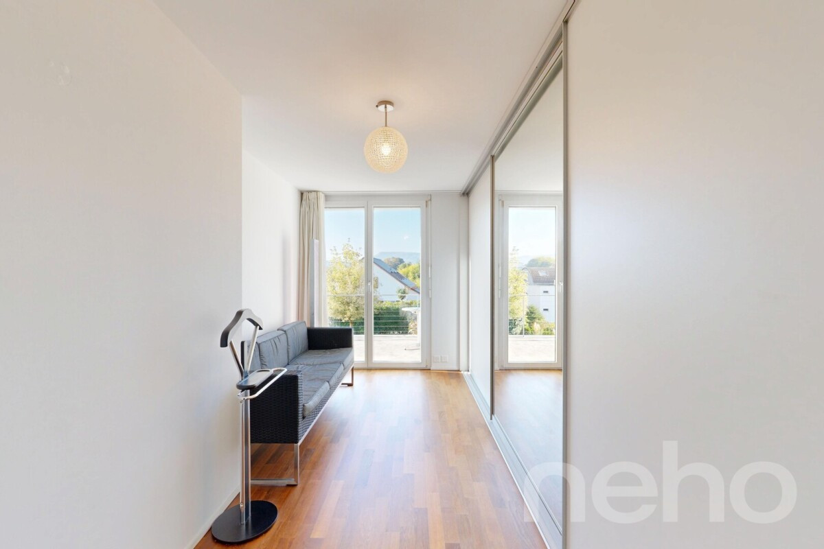 Im Obergeschoss befinden sich zwei grosszügige Schlafzimmer, eine praktische Ankleide sowie ein Badezimmer mit Badewanne. Sowohl die Ankleide als auch eines der Schlafzimmer verfügen über direkten Zugang zur sonnigen Terrasse mit schöner Aussicht auf den Garten, das Wohnquartier und die umliegende Landschaft.