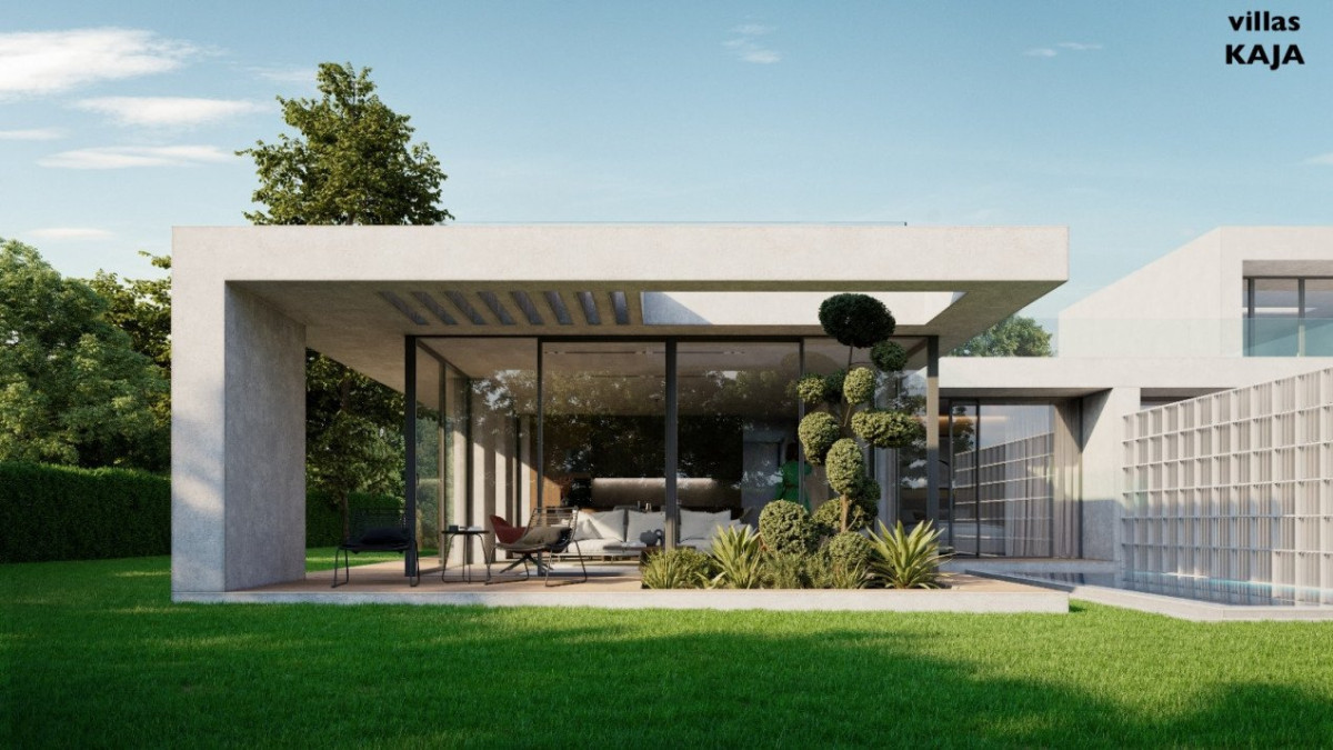 Dieses avantgardistische Bauwerk zeichnet sich durch ein teilweise begrüntes Flachdach und große Fensterfronten aus, die die Räume mit natürlichem Licht durchfluten. Das klare, moderne Design schafft eine beruhigende Atmosphäre in diesem wahren Refugium.