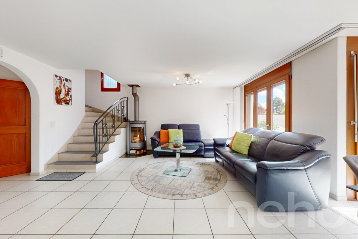 Der grosszügige Wohn- und Essbereich bildet das Zentrum des Hauses. Raumhohe Fenster sorgen für viel Tageslicht, während das Cheminée an kühleren Tagen eine behagliche Stimmung schafft. Von hier aus gelangen Sie direkt auf den gedeckten Sitzplatz und in den liebevoll unterhaltenen Garten mit Umschwung und teilweise freier Aussicht ins Grüne.