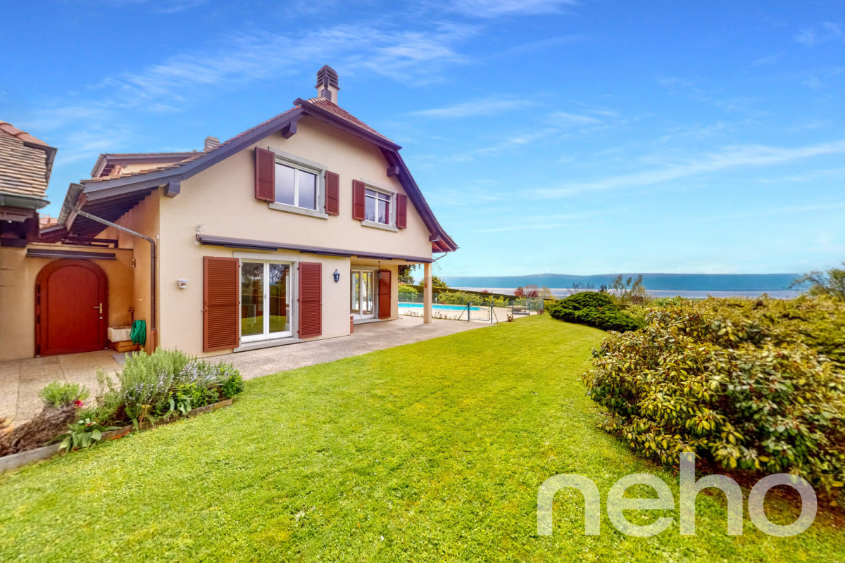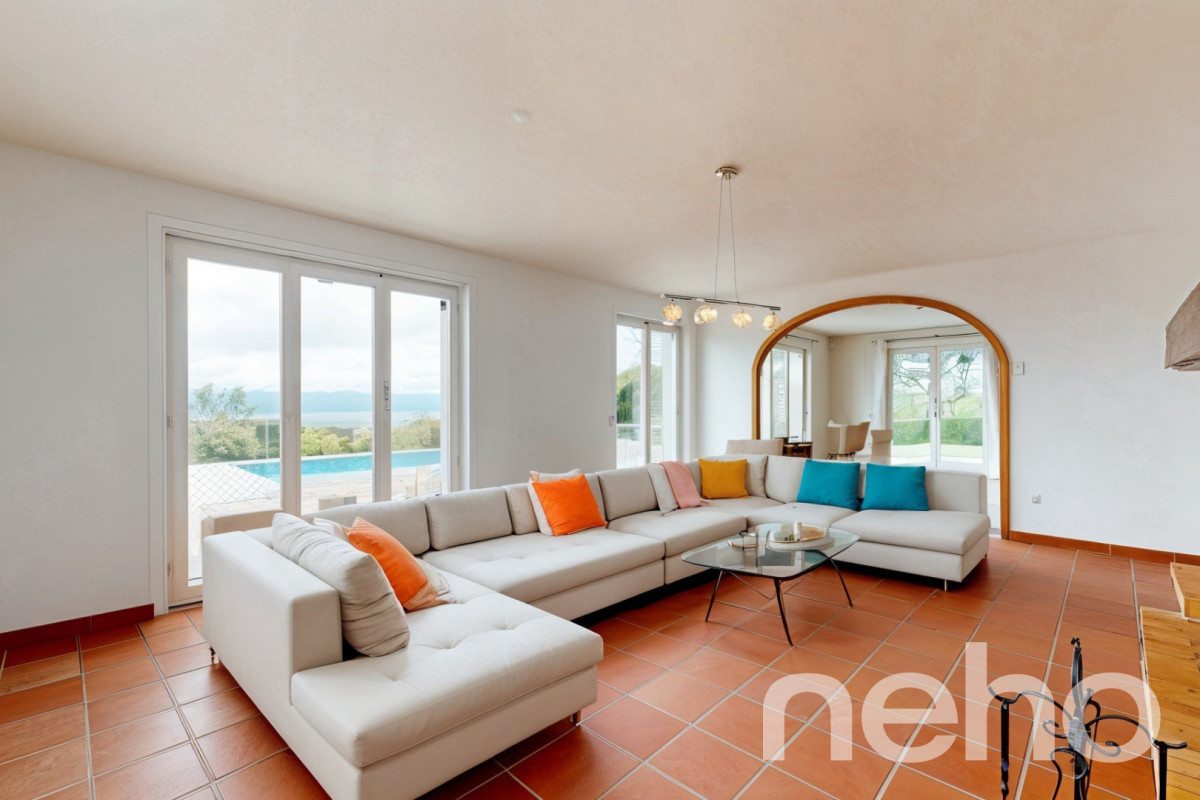 Le portail s'ouvre sur une superbe villa individuelle avec beaucoup d'espace, au calme absolu, bénéficiant d'une vaste parcelle arborée de plus de 2000m2 et d'une vue panoramique à couper le souffle sur le lac Léman et les montagnes environnantes.