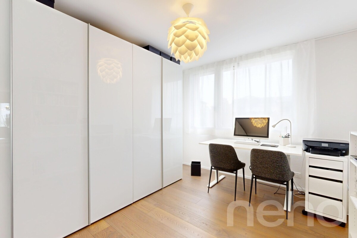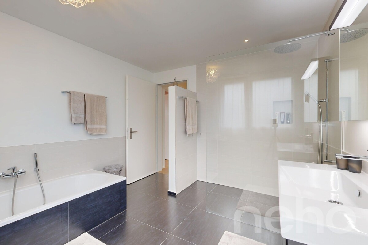 Auf derselben Ebene befinden sich ein Büro ? momentan ohne Türe, kann aber problemlos eingebaut werden ? sowie ein geräumiges WC. Im Obergeschoss erwarten Sie zwei Zimmer, darunter ein Schlafzimmer mit Ankleidezimmer, sowie ein modernes Badezimmer mit Badewanne und Dusche. Zusätzlichen Komfort bieten ein Reduit mit integriertem Waschturm, ein weiteres Reduit und ein Estrich für zusätzlichen Stauraum.