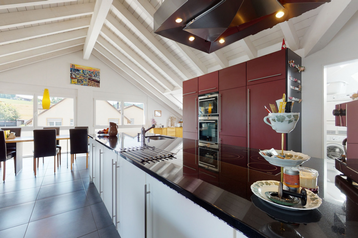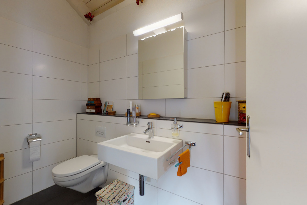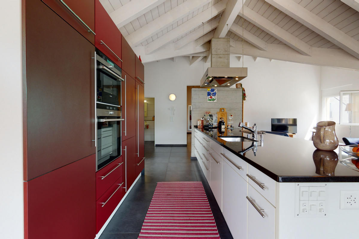 Die flexible Raumaufteilung und der helle Wohn-/Essbereich sorgen für Komfort und Abwechslung. Der grosszügige, offene Küchenbereich bestückt mit Steamer und Backofen laden zum Ausprobieren von Koch- und Backkünsten ein. Die Nasszellen wurden mit praktischen Einbaumöbeln ergänzt. Neben dem eigenen Waschraum in der Wohnung sind 1 Garagen- und 1 Abstellplatz vorhanden.