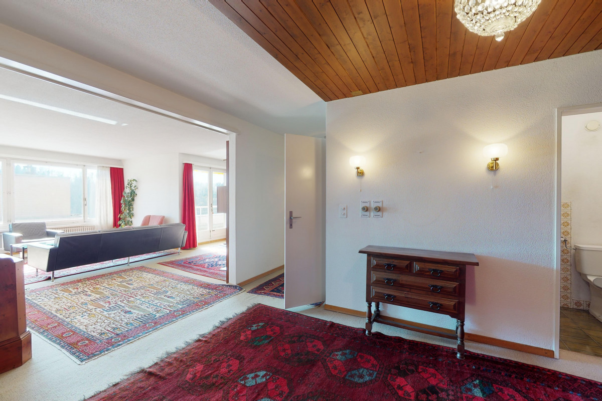 Diese grosszügig geschnittene 5.5 Zimmer Terrassenwohnung mit Gartenanteil und Wintergarten aus dem Jahre 1973 mit interessantem Grundriss, in der Naherholungszone des Uetlibergs gelegen, besticht durch den grossen Eingangsbereich mit Oberlicht und den offenen Wohn-/Essbereich. Grosse Schlafzimmer, zwei Nasszellen, ein Gäste-WC, ein praktischer Abstellraum, ein Keller sowie eine Doppelgarage runden das Angebot ab. Hier können Sie noch eigene Ideen einbringen.