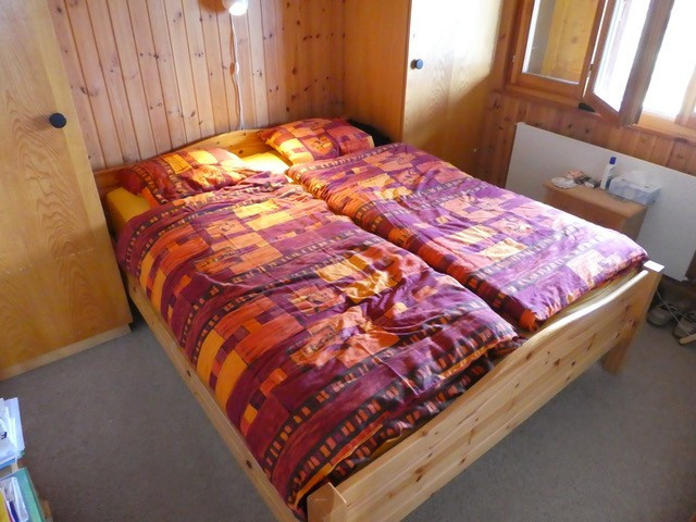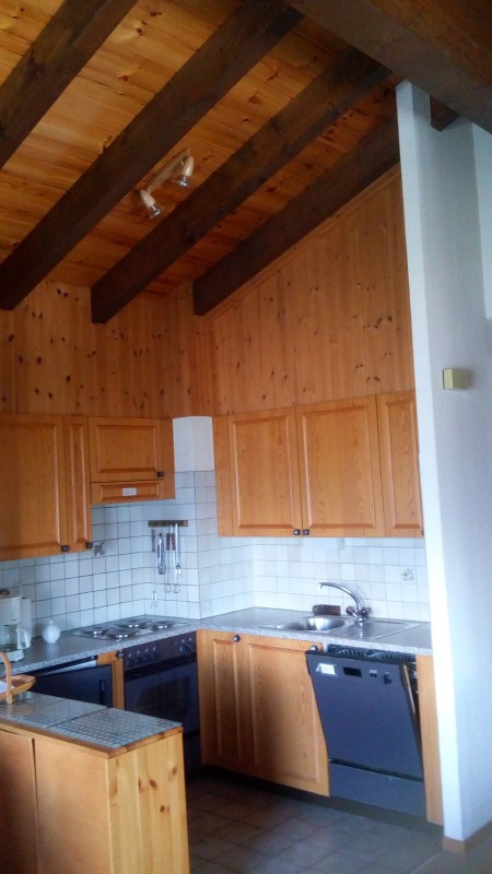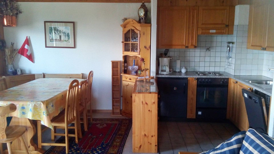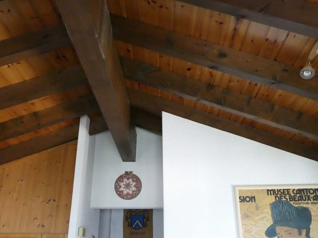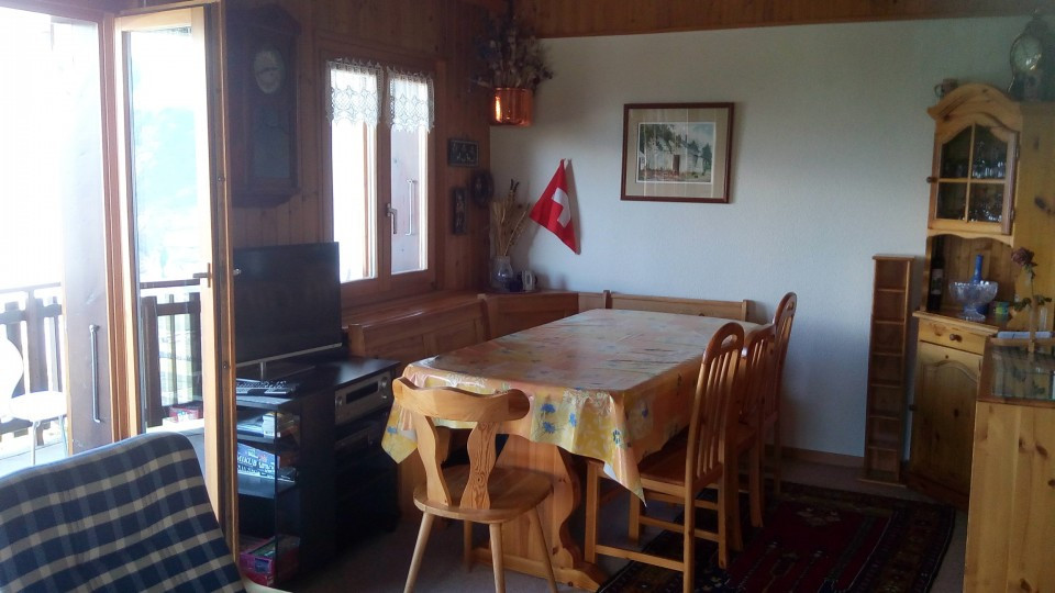 Diese Wohnung mit Holzbalken befindet sich in einem Gebäude im Chaletstil im Touristenviertel von Veysonnaz oberhalb des Zentrums von Sion / Wallis.