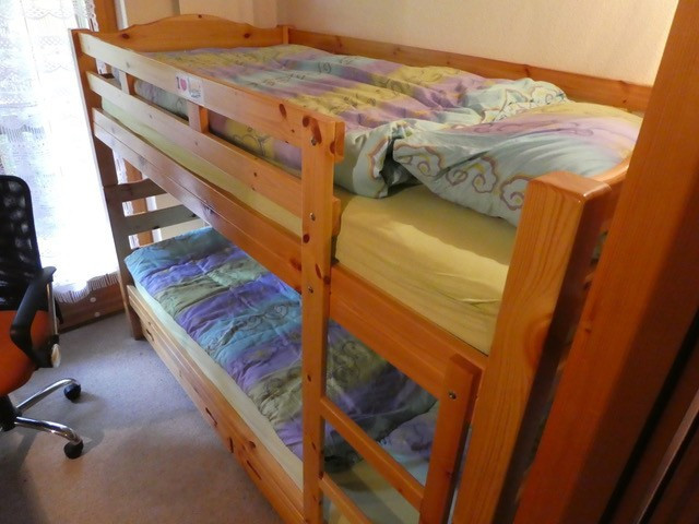 1 Schlafzimmer mit 2 Etagenbetten und einem Schreibtisch;