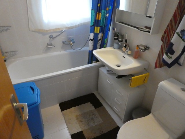 1 Badezimmer mit WC, Waschbecken und Badewanne;