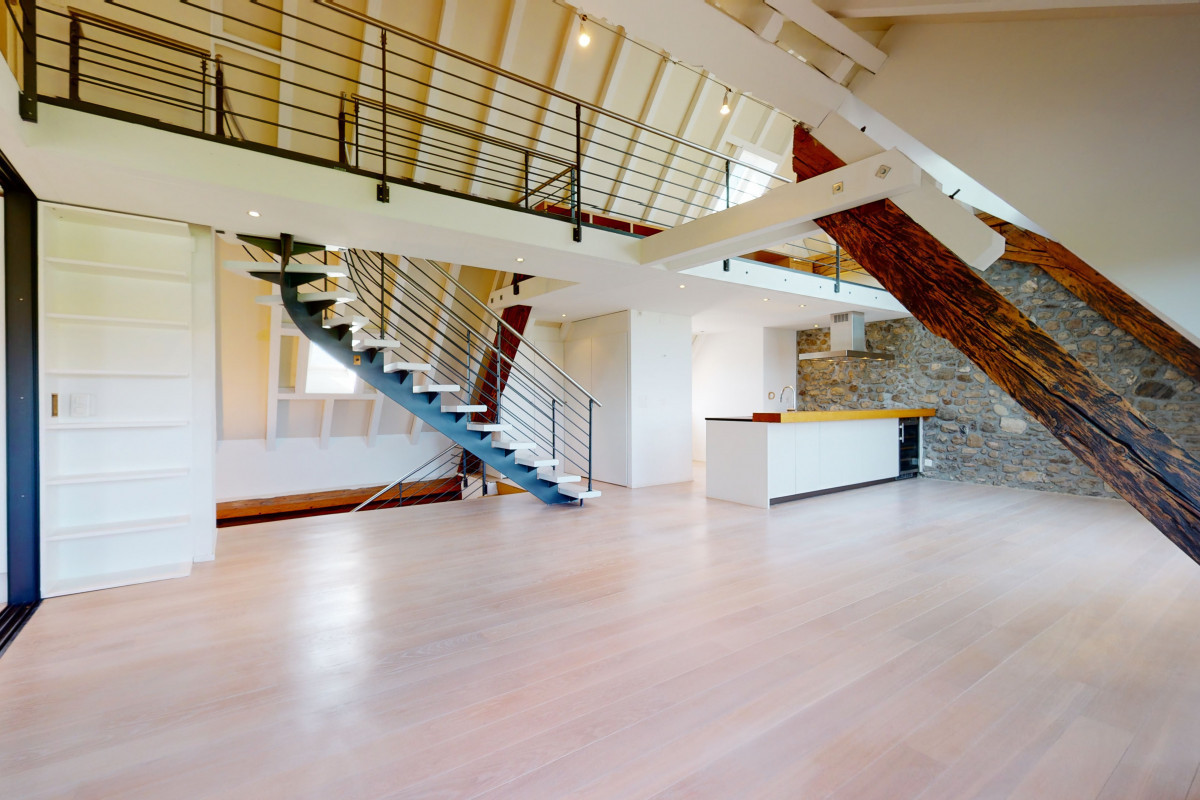2 chambres, dont une suite parentale, 2 salles de bains complètes, majestueux espace central cuisine-salon ouvert, 2 espaces et coursive en mezzanine.