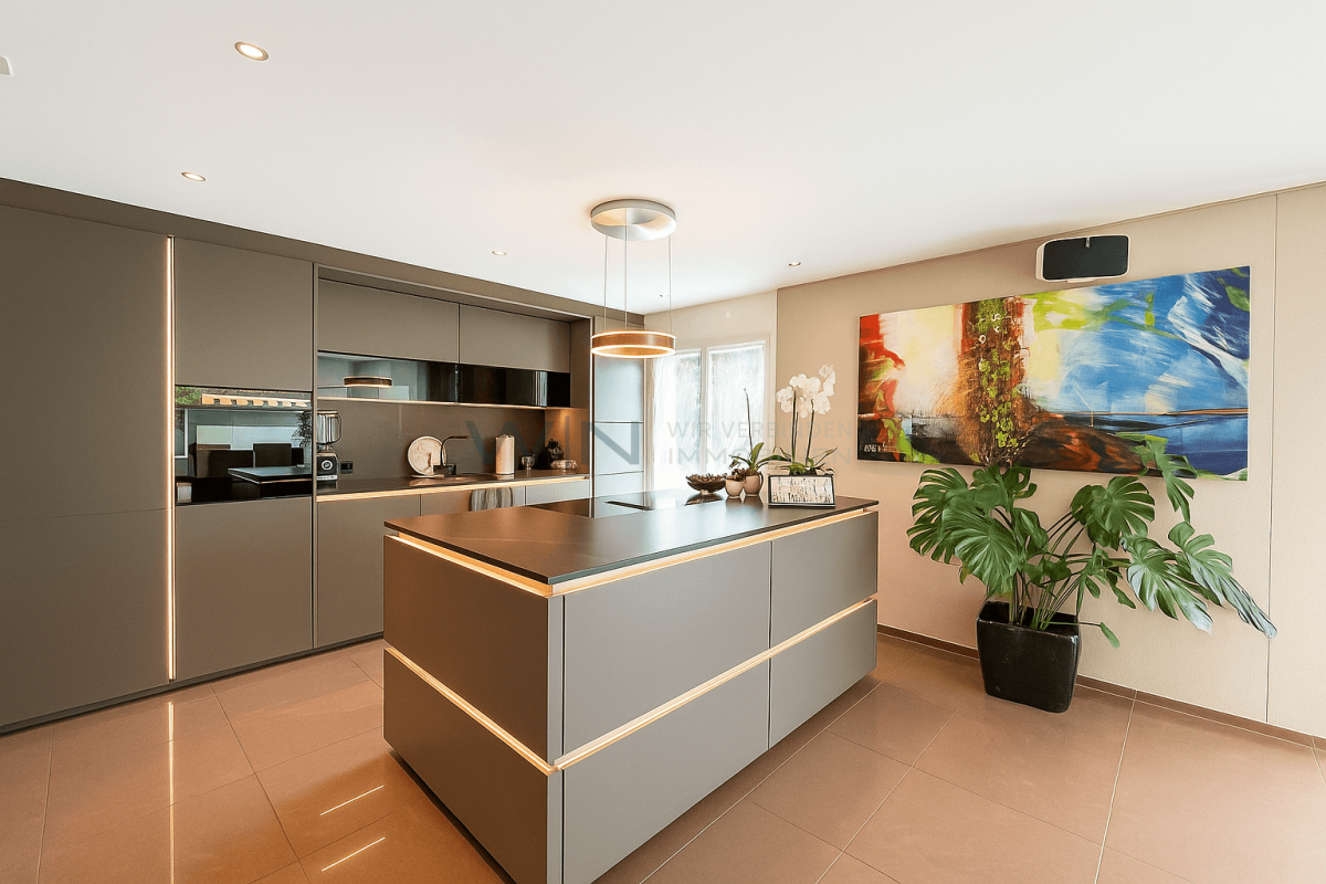 Die Küche, neu im Jahr 2024 eingebaut, ist ein echtes Highlight. Eine stilvolle Kochinsel mit Lichtsensorik und einer Arbeitsoberfläche aus Dekton ? extrem kratz- und hitzebeständig ? bildet das Zentrum des Raumes. Ein übergrosser Liebherr-Kühlschrank mit separatem Kühlfach, ein selbstreinigender Siemens StudioLine-Backofen, ein Miele-Geschirrspüler sowie eine integrierte Filteranlage im Wasserhahn unterstreichen den hohen Anspruch an Qualität und Komfort.