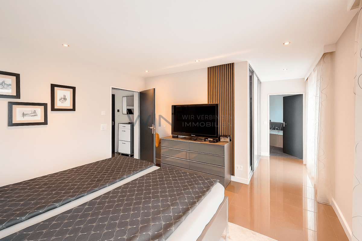 Das Elternschlafzimmer wurde 2022 vollständig renoviert und besticht mit Akustik-Designrillen, einem begehbaren Kleiderschrank mit bodenlangem Spiegel und direktem Zugang zum grosszügigen Bad en suite. Ein weiteres Badezimmer überzeugt mit übergrossen, weissen Feinsteinzeugplatten, Granitablage, grosser Dusche und Tageslichtfenster ? ein Ort der Ruhe und Entspannung.