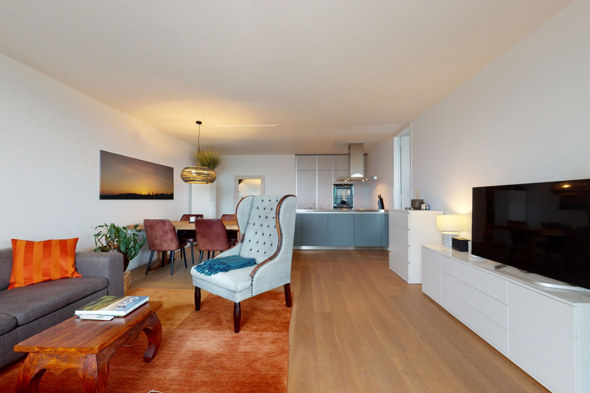 A harmonious ensemble that positions itself confidently and at the same time complements the urban context in a meaningful way - that is the claim in the exterior view! This high-quality building was constructed in 2015 and is suitable for people with a certain flair for modern living with modern equipment. The 2.5 Rooms flat is located on the 16th floor and is only 10 minutes away from the ZRH.