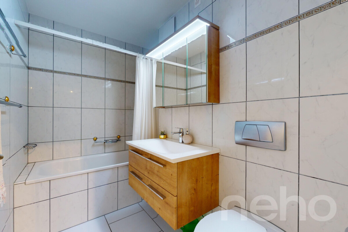 Zur Wohnung gehören ein eigener Waschraum, ein zusätzlicher Hobbyraum sowie ein Tiefgaragenplatz. Besucherparkplätze befinden sich ebenfalls in der Tiefgarage. Besonders praktisch: Der Zugang erfolgt über eine Gegensprechanlage direkt vom Fahrzeug aus, was den Alltag für Gäste deutlich erleichtert.