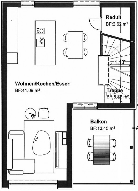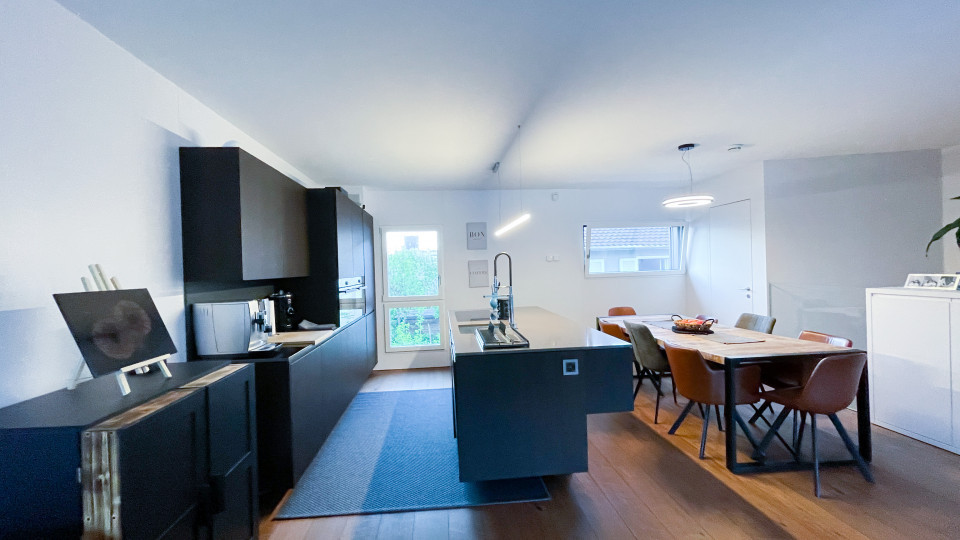 Über die Treppe gelangt man in das grosszügige, offene Obergeschoss und den Wohn-/Ess-/Küchenbereich sowie einer überdachten Loggia welche lange Sommernächte mit Gästen garantiert.
