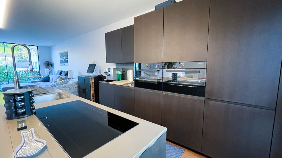 Die offene Küche ist ein Traum und perfekt ausgestattet mit modernsten Markengeräten und edlen Abdeckungen und Armaturen. Neben der Küche befindet sich praktischerweise noch ein kleines Reduit.