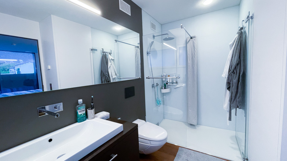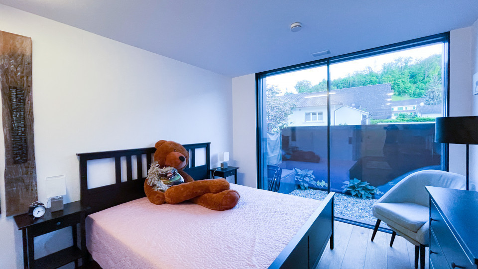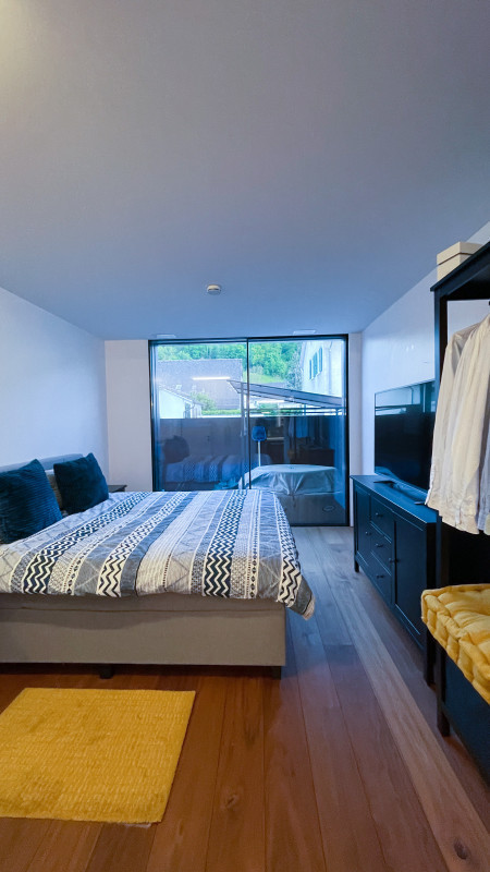Der Eingangsbereich hat eine grosszügige Garderobe, samt Reduit unter der Treppe eingebaut. Der offene Raum mit bodenebenen Fenstern, kann mit einer Abtrennung perfekt als Büro, Gästezimmer oder als Atelier/Fitnesszimmer genutzt werden. Ebenfalls im Erdgeschoss befindet sich der grosszügige Master-Bedroom mit grossen Einbauschränken sowie Zugang zum geschützen, stylischen und pfelgeleichten Garten (perfekt für einen Whirlpool). An den Masterbedroom angeschlossen befindet sich das grosszügige, luxuriöse Badezimmer mit bodenebener Dusche.