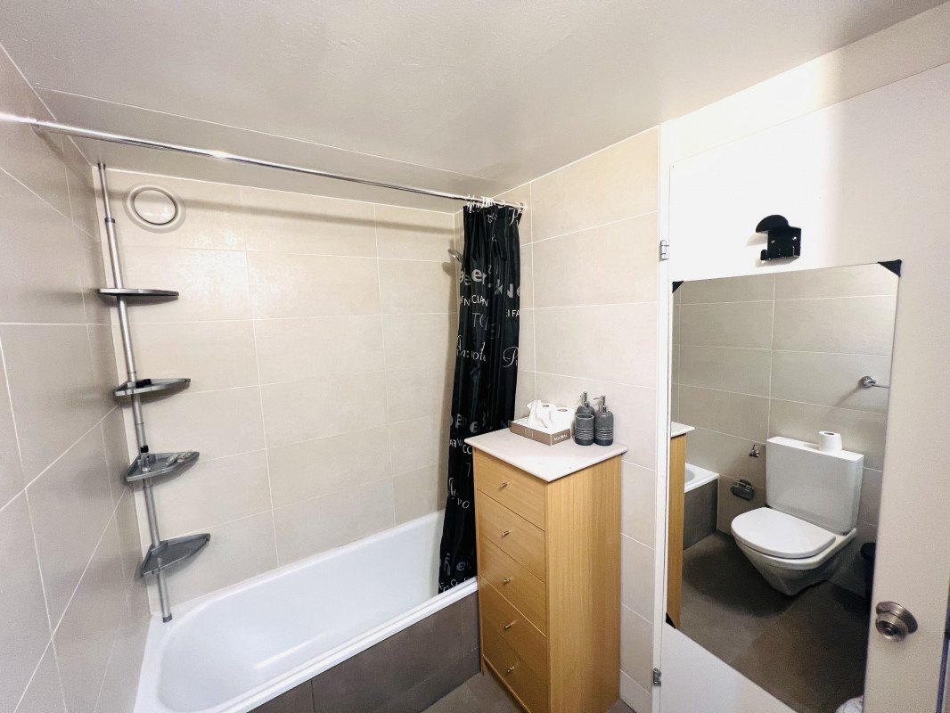 Salle de bain fonctionnelle et nombreux rangements intégrés.